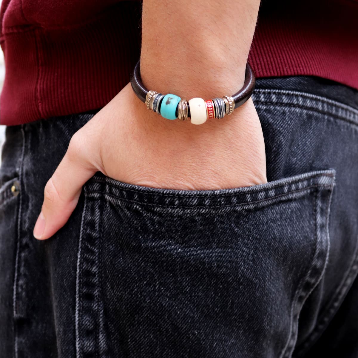 Pulsera Hombre Aland de cuero con resina turquesa y blanca