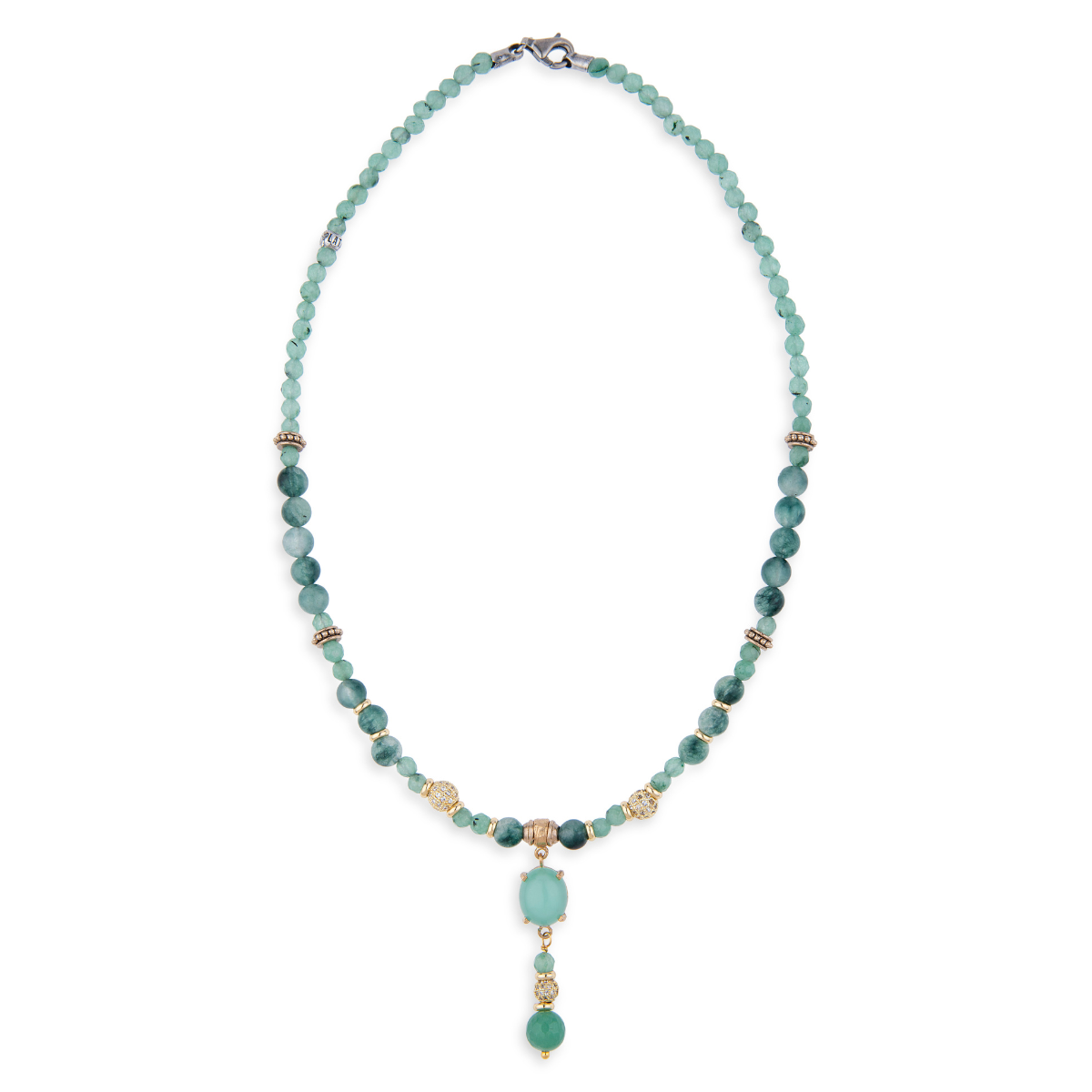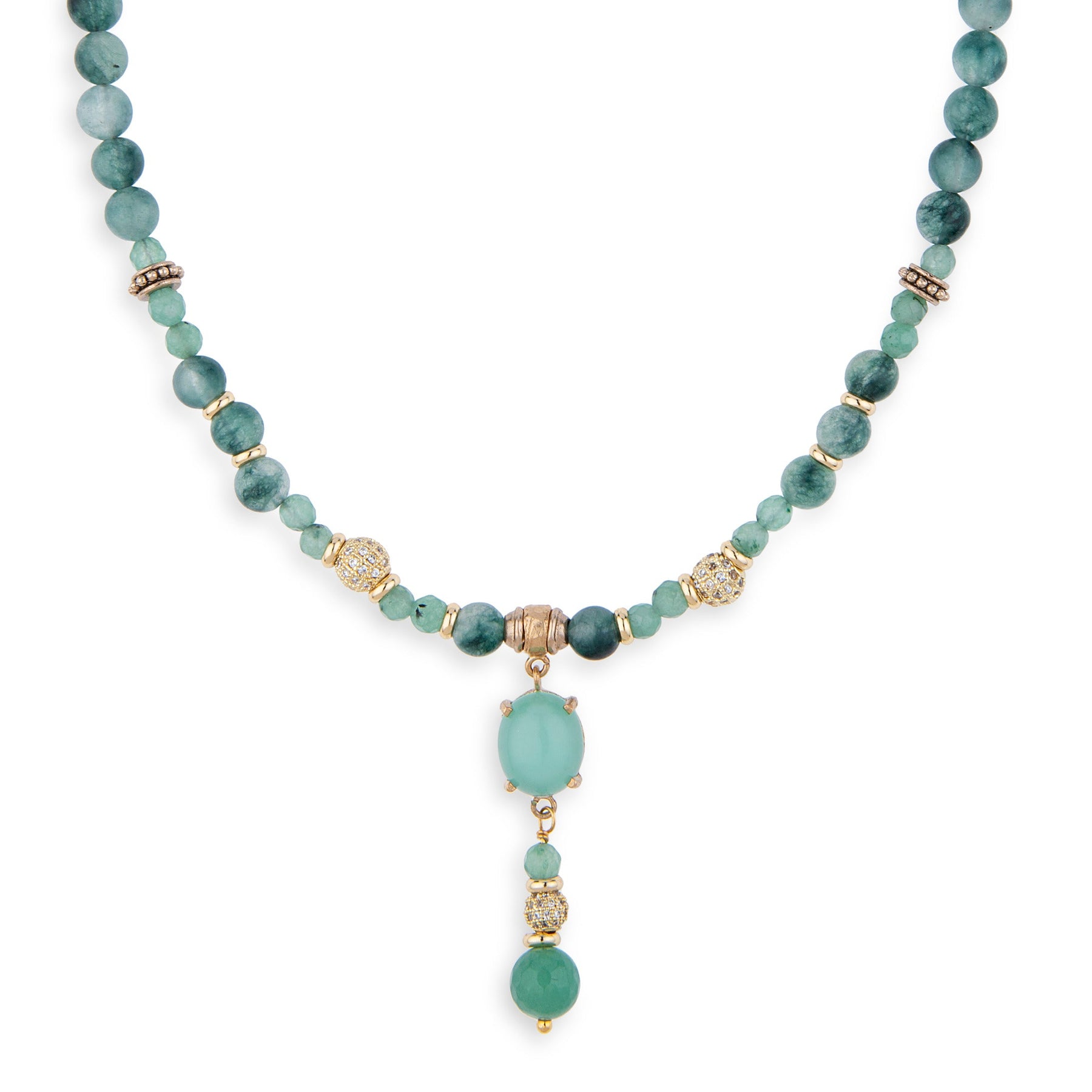 Collar de cuentas de ágatas. Incluye un colgante central de ágata verde ovalado y entrepiezas de bronce con circonitas blancas incrustadas.