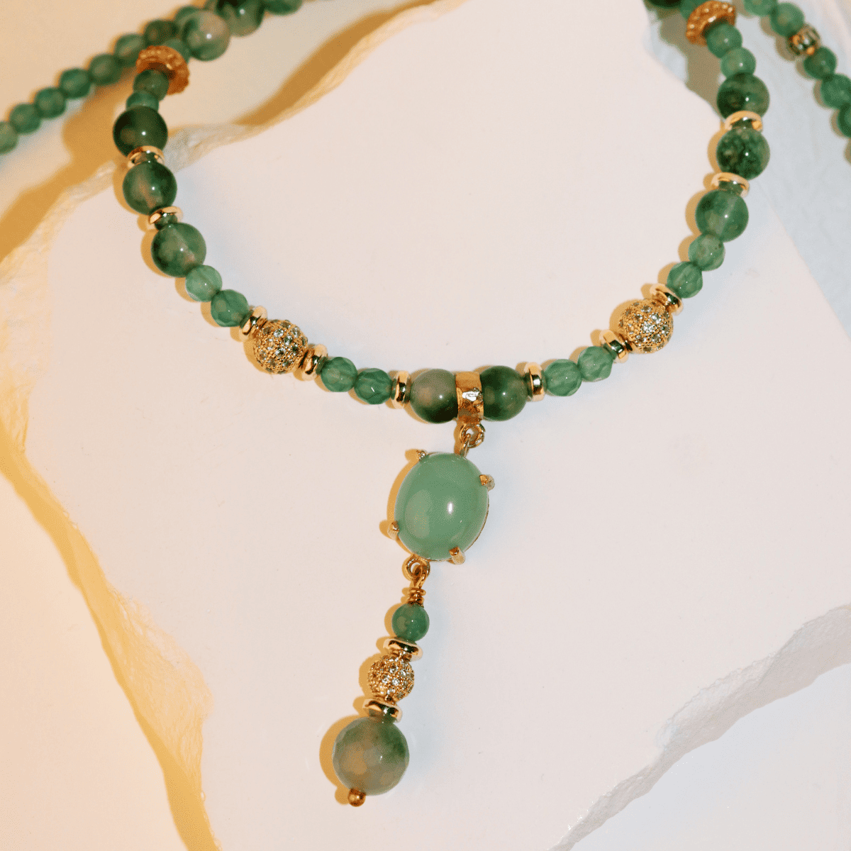 Yulai es la combinación perfecta de materiales nobles y detalles refinados. Las ágatas, con sus tonalidades verde naturaleza, aportan color y equilibrio, mientras que el brillo de las circonitas crea un look delicado y lleno de armonía que realza tu esencia.