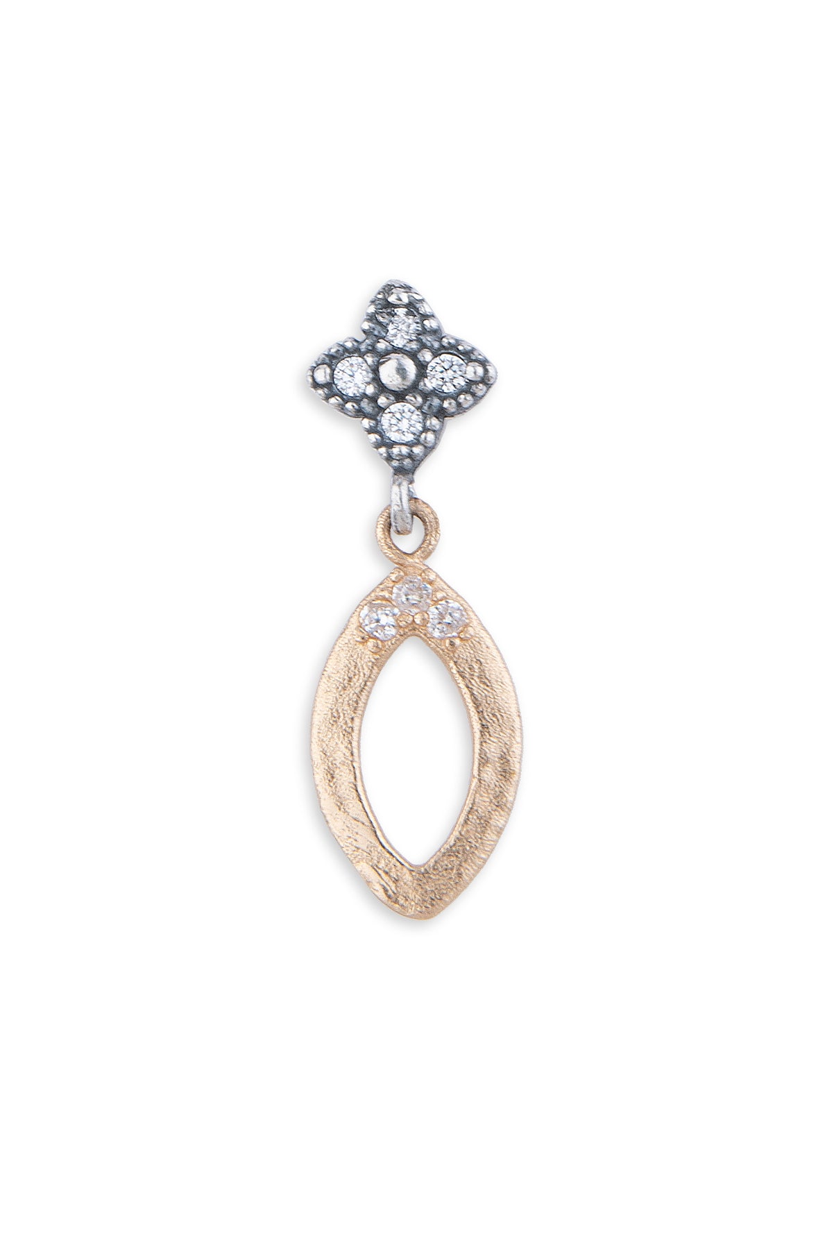 Pendientes en Plata 925, bronce y circonitas. Pasador plata en forma de flor de cuatro pétalos con circonitas engastadas. Colgante de bronce liso en forma almendrada con tres circonitas blancas incrustadas. Cierre a presión de plata hipoalergénico.