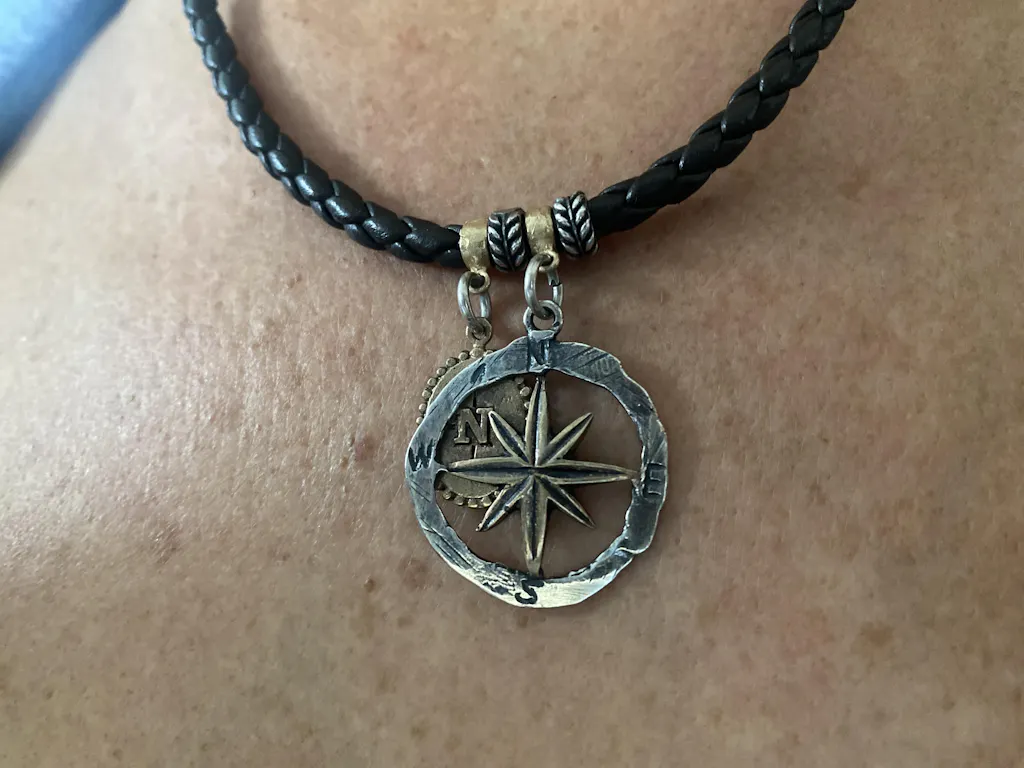 Este collar único combina la calidez del cuero marrón trenzado con el brillo del bronce y la plata 925. La rosa de los vientos, símbolo de aventura y exploración, es el punto focal de este diseño original. La medalla de bronce con el norte añade un toque náutico, mientras que las entrepiezas de bronce y plata complementan el conjunto.