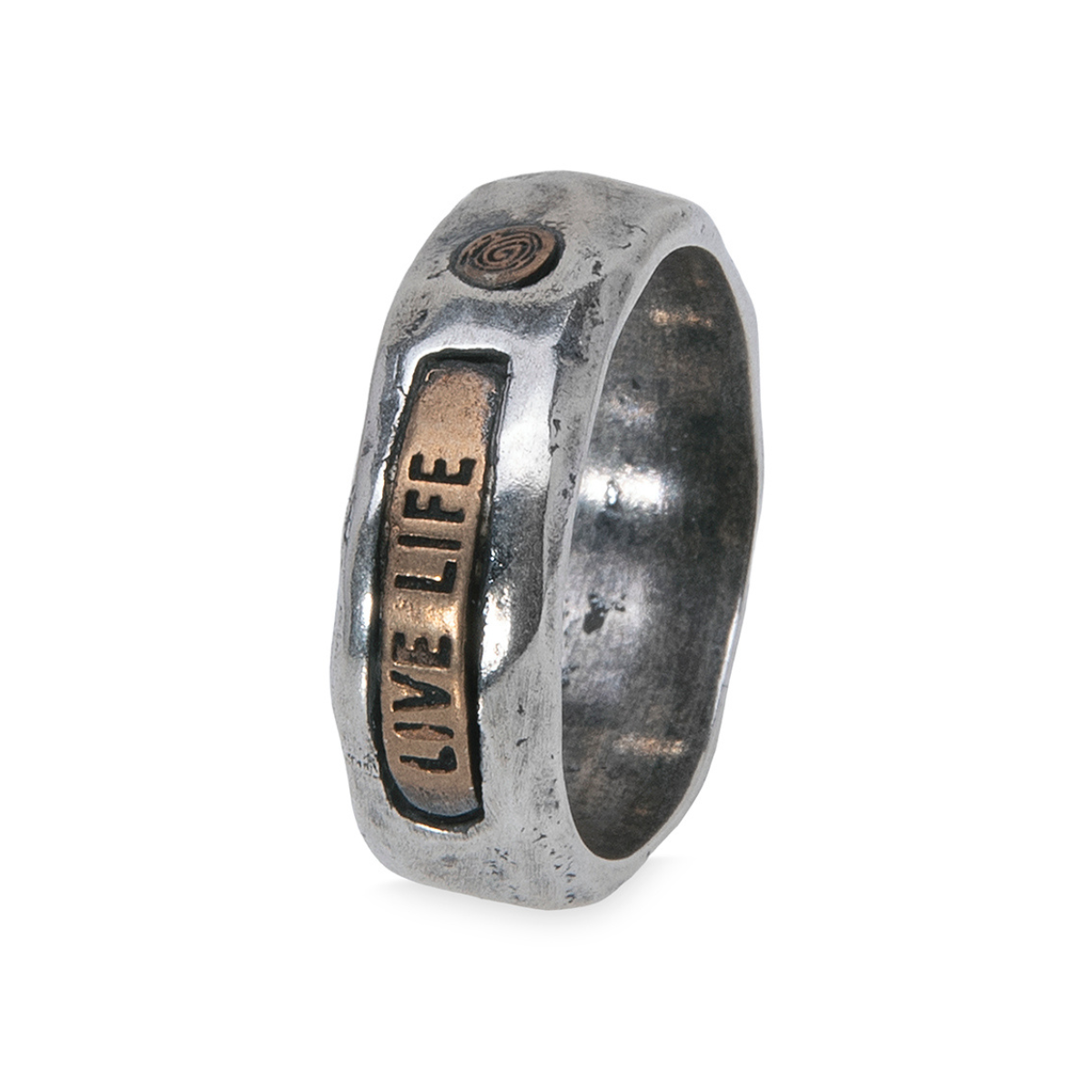 Anillo hombre de plata 925 de forma irregular con placa de bronce "Live life" y huella de PLATADEPALO.