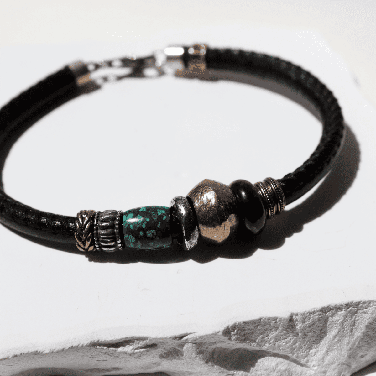 Pulsera para hombre Mikazuki de cuero negro con entrepieza central de bronce, resinas ojo de tigre y alargada verde jade y entrepiezas de plata 925 y bronce.