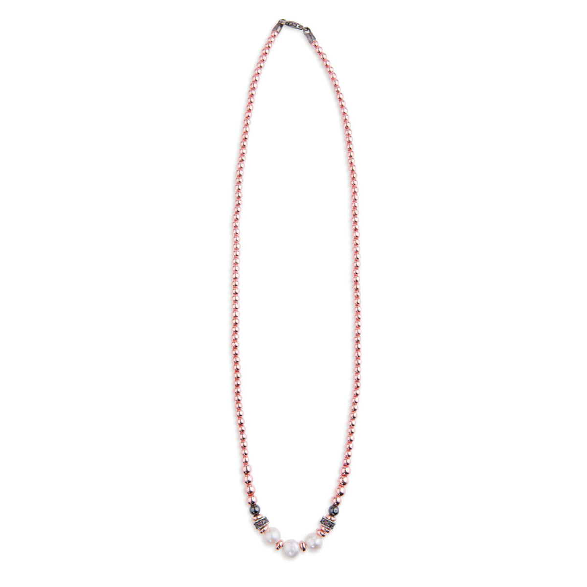 Largo 45CM. Combina nuestra colección de pulseras de hematite rosa con un collar a juego. El novedoso colgante CARLA te seducirá. Elaborado con hematite rosa y gris y decorado con tres perlas de agua y donuts con circonitas marrones.