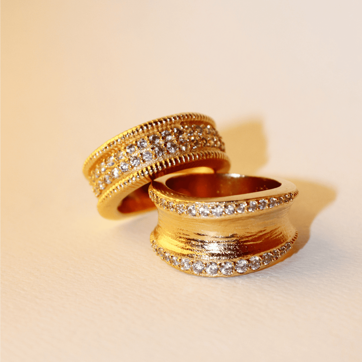 Anillo elaborado con bronce chapado en oro amarillo y decorado con circonitas blancas incrustadas.