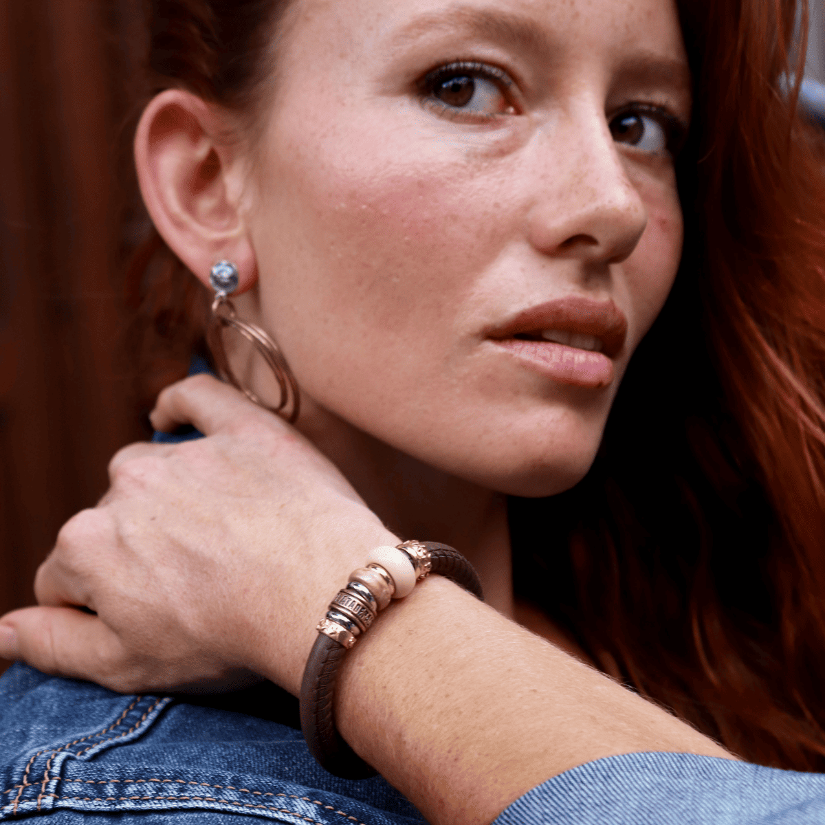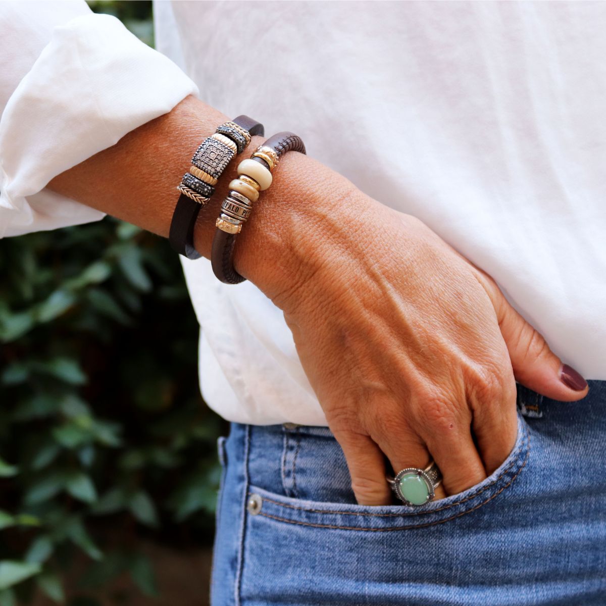 Pulsera para mujer Jessie de cuero marrón redondo, con dos piezas de resina en marrón y beige, adornada con entrepiezas de plata y bronce con la insignia de PLATADEPALO. Cierre magnético de acero inoxidable en color dorado.
