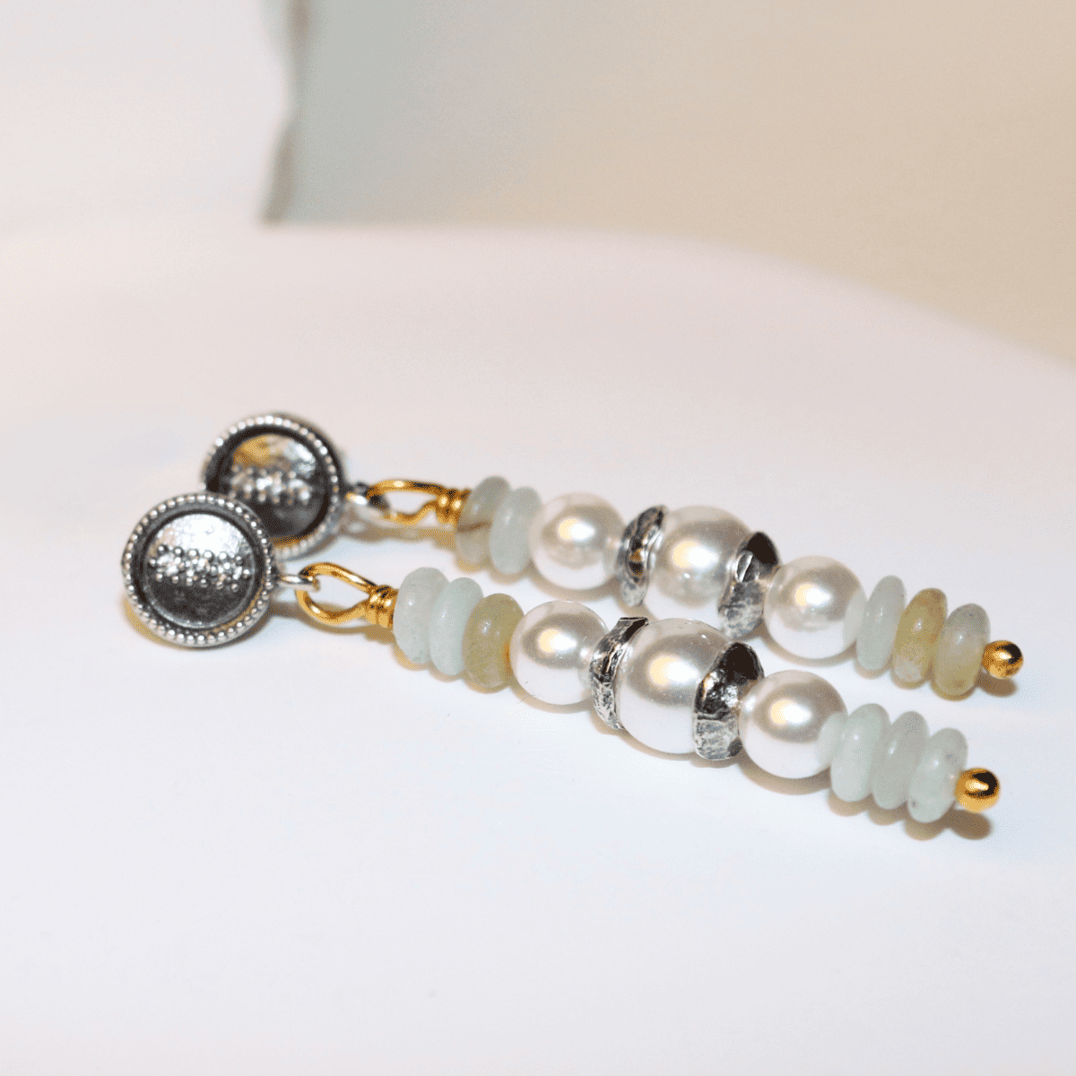 Descubre un espíritu tranquilo y distintivo con estos pendientes de amazonita, perfectos para un toque de luz y elegancia. La suave tonalidad se fusiona con la pureza de una perla blanca, ofreciendo un balance perfecto de color y brillo. Los detalles de las casquillas de plata añaden un toque refinado, haciendo de cada pendiente una pequeña obra de arte para quienes aprecian la belleza sutil.