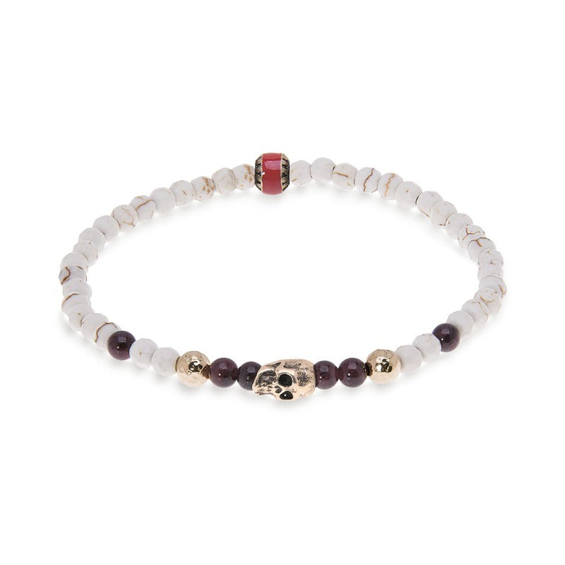 Una novedosa combinación de elegancia y rebeldía en una pulsera elástica. Combinada con turquesa blanca, bolas granates y una pieza protagonista, la calavera de bronce. Decorada con entrepiezas de bronce y una bola esmaltada en rojo con el sello de la marca. Diseñada y hecha a mano artesanalmente por PLATADEPALO en España.