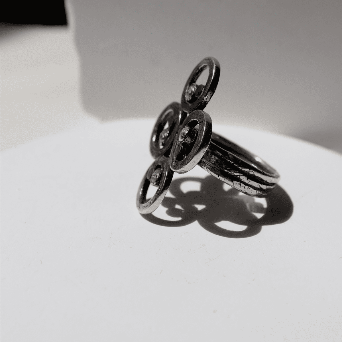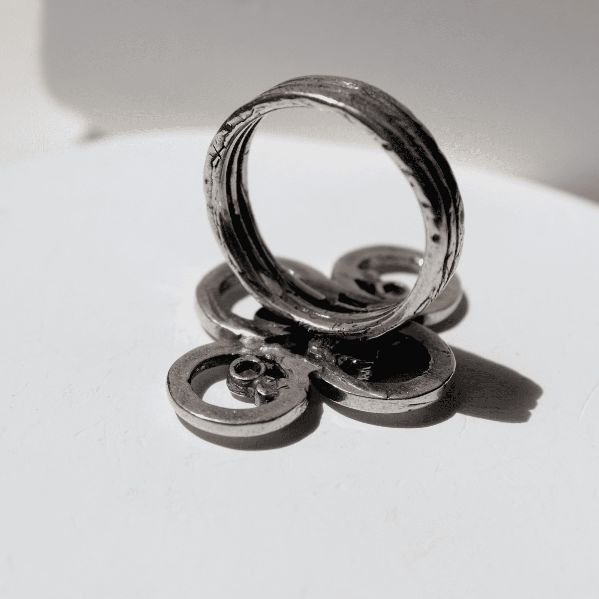 El anillo Enrai es la energía que irrumpe con fuerza y transforma, como un trueno que rompe el silencio para anunciar un nuevo comienzo. Su nombre, que en japonés significa “trueno distante”, evoca poder, movimiento y la belleza de lo impredecible. Las espirales simbolizan el fluir constante de la vida, mientras que los puntos representan momentos de claridad y propósito. Es un recordatorio de que cada giro y cada pausa forman parte de un mismo viaje hacia nuestra propia esencia.