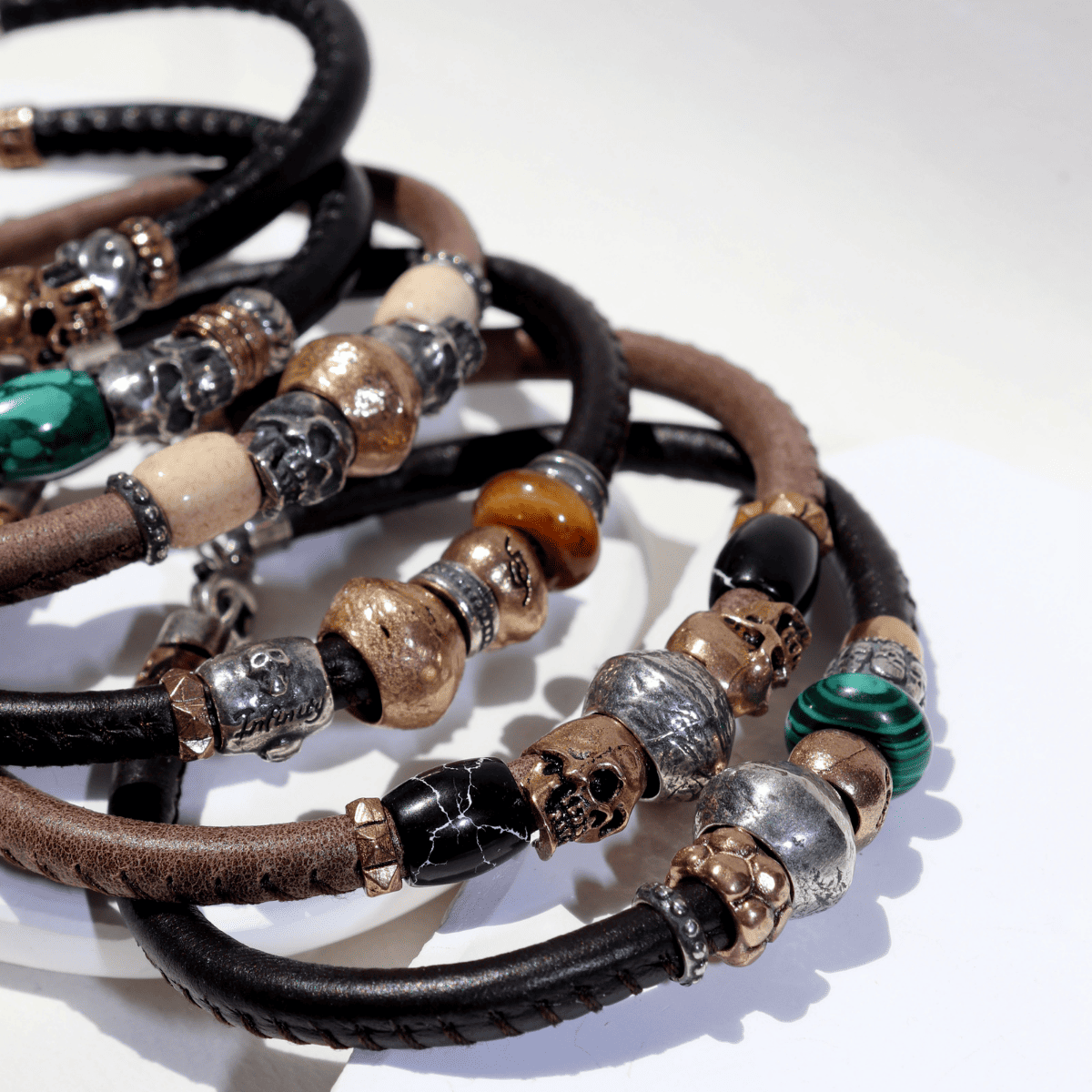Pulsera Koshin de cuero con calavera de bronce y resina jade