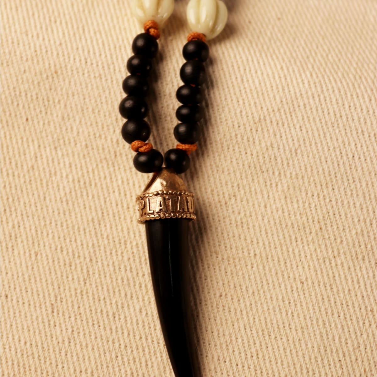 El Collar Unisex Nusa combina un hilo largo en color azafrán con piedras de ónix mate y piezas talladas en forma de flor color marfil que aportan luz y delicadeza al diseño. Como colgante principal, un cuerno negro de resina con soporte de bronce y la insignia de la marca añade un toque distintivo y contemporáneo, fusionando tradición y estilo moderno.