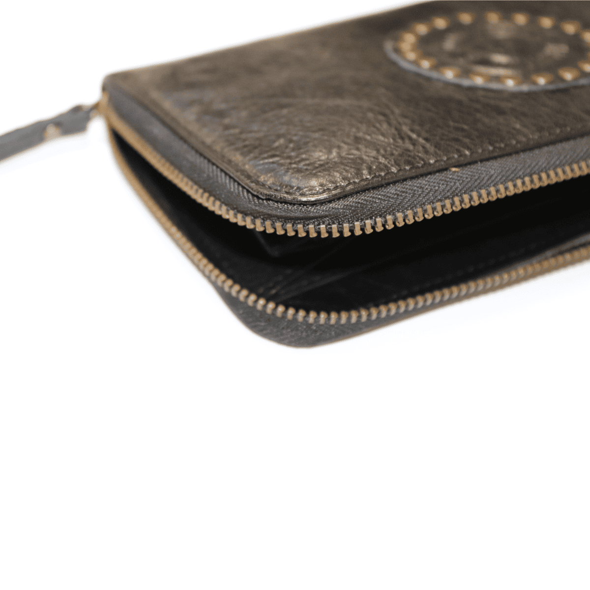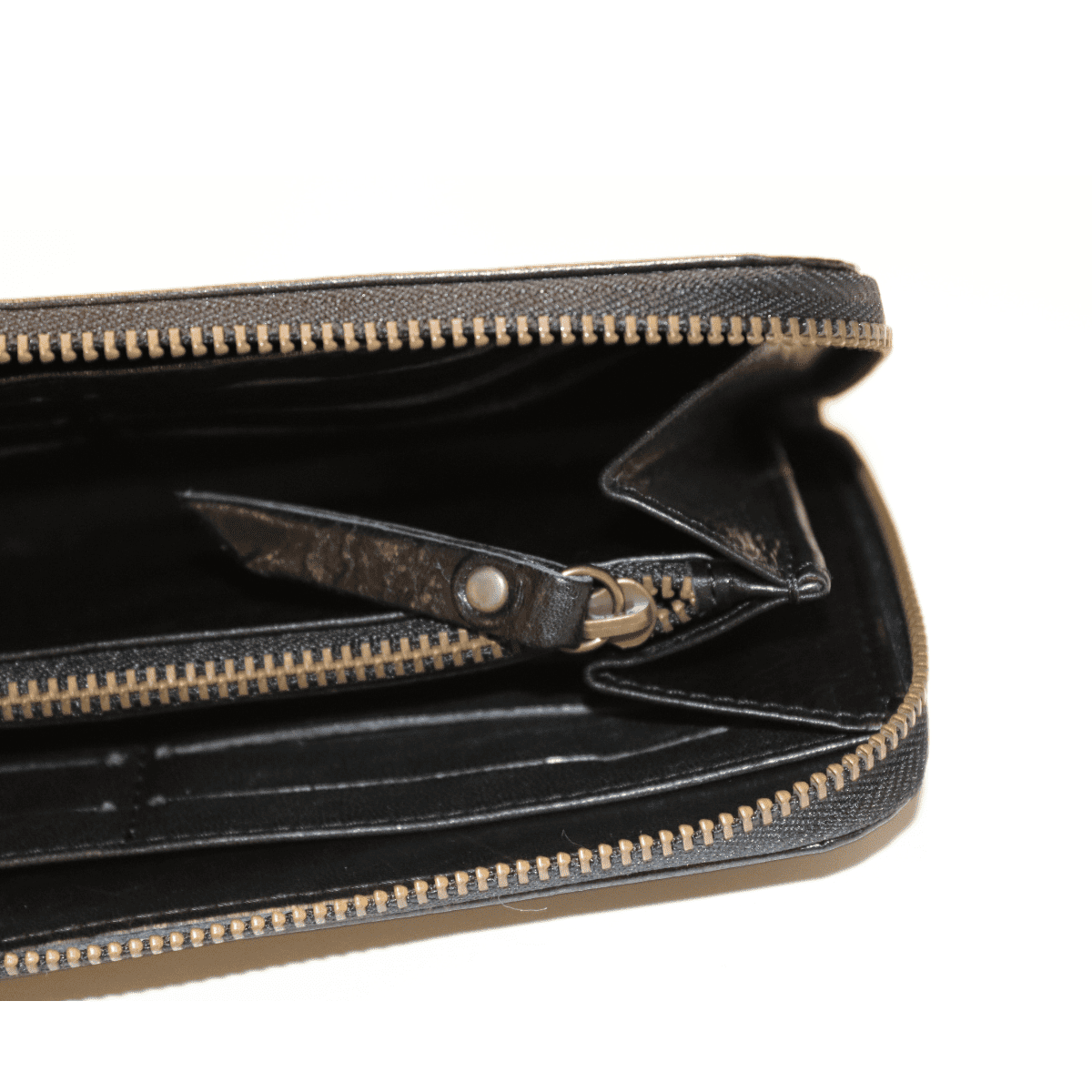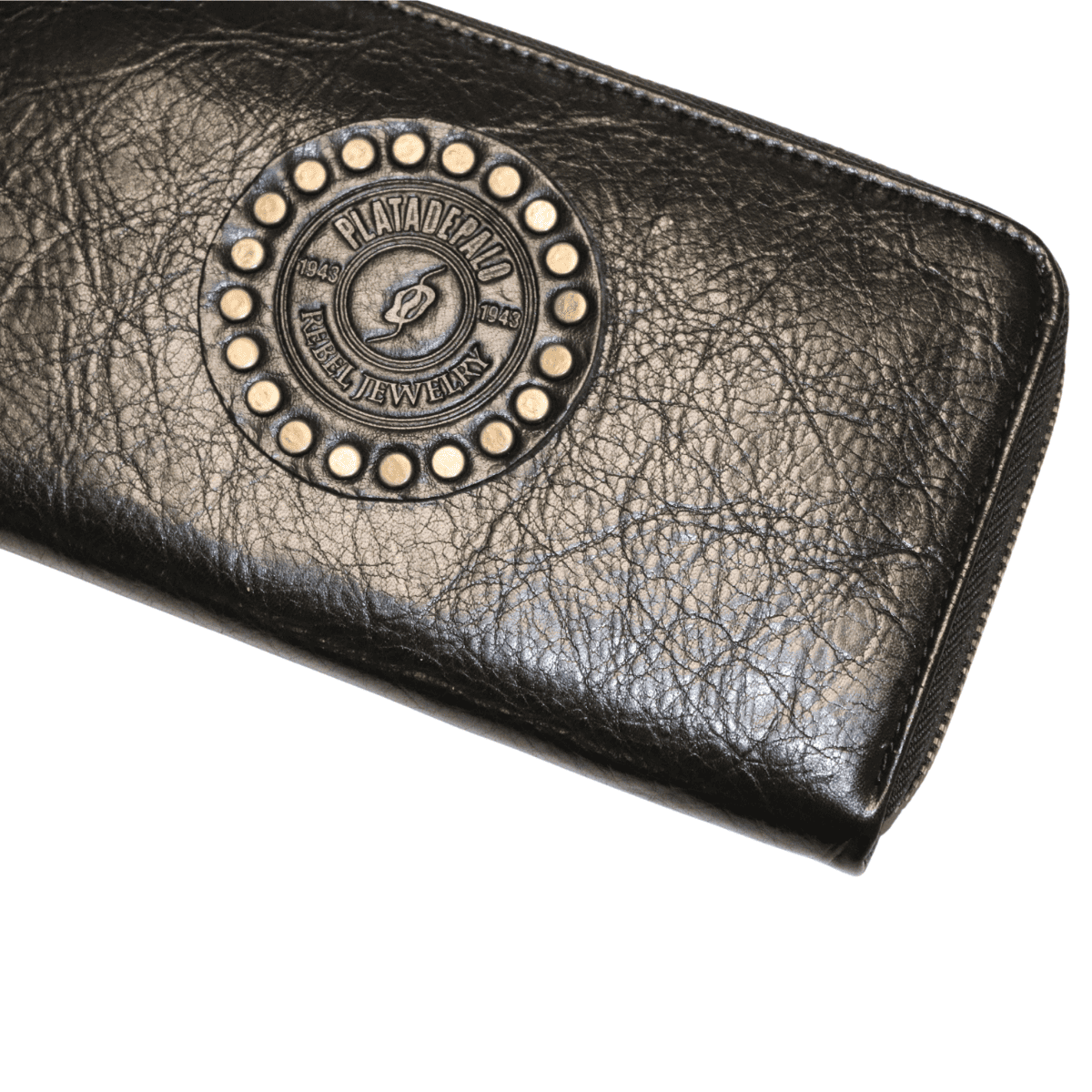 Mehrzweck-Geldbörse mit Reißverschluss aus schwarzem Leder, Maße 20 x 10 x 1,5 cm. Außen mit dem PLATADEPALO-Siegel gekennzeichnet.