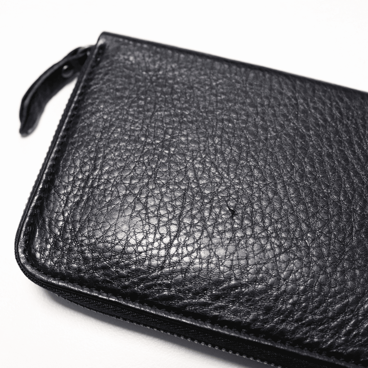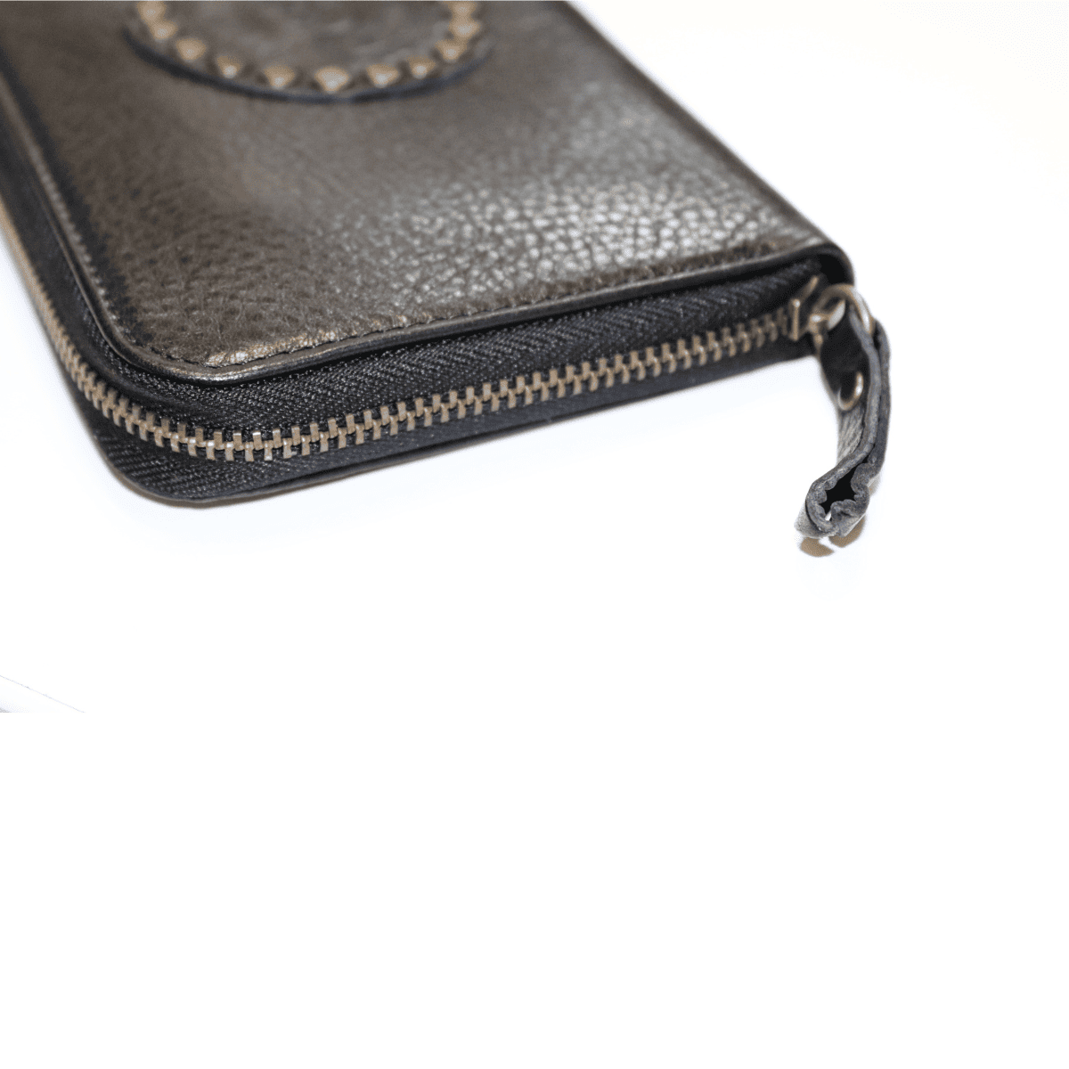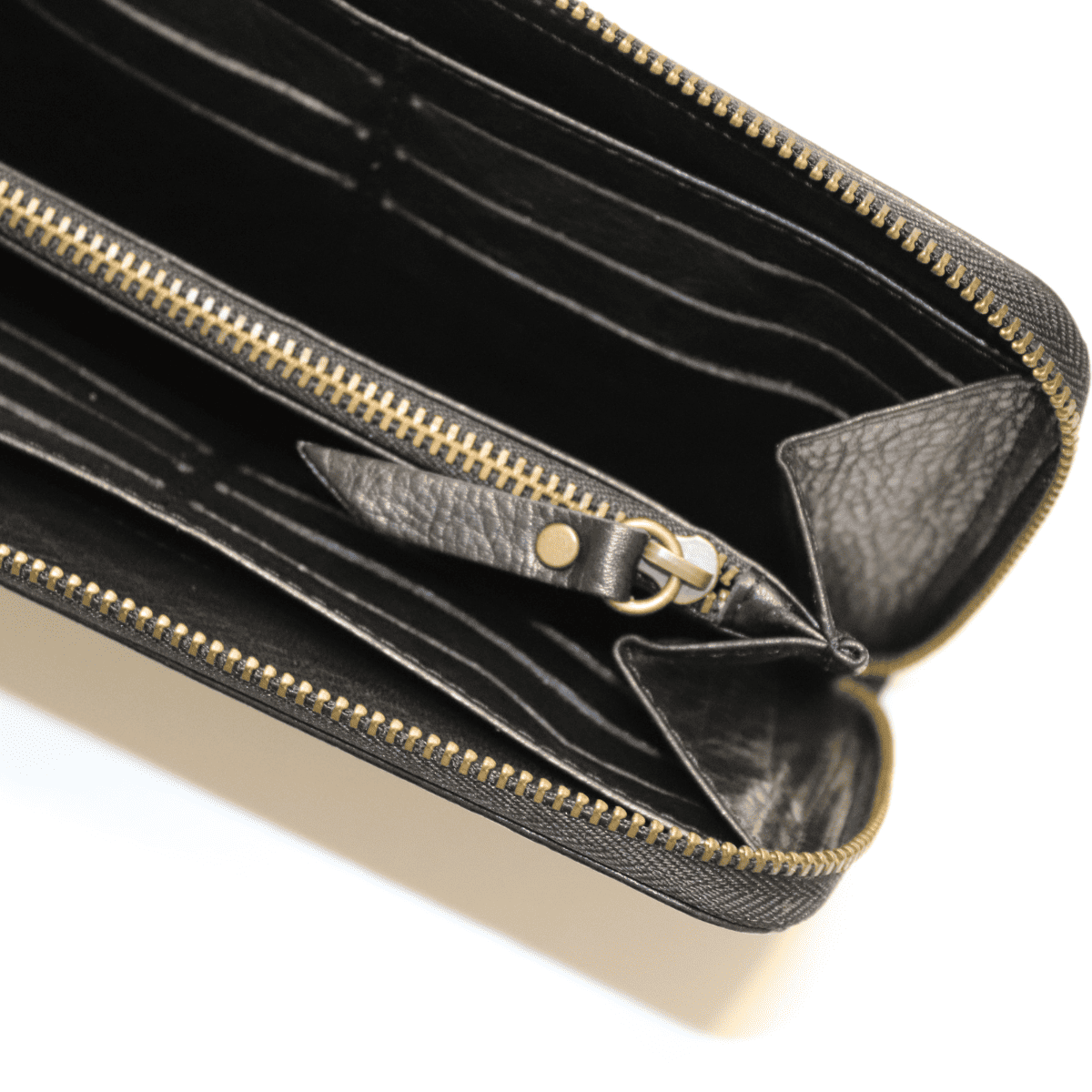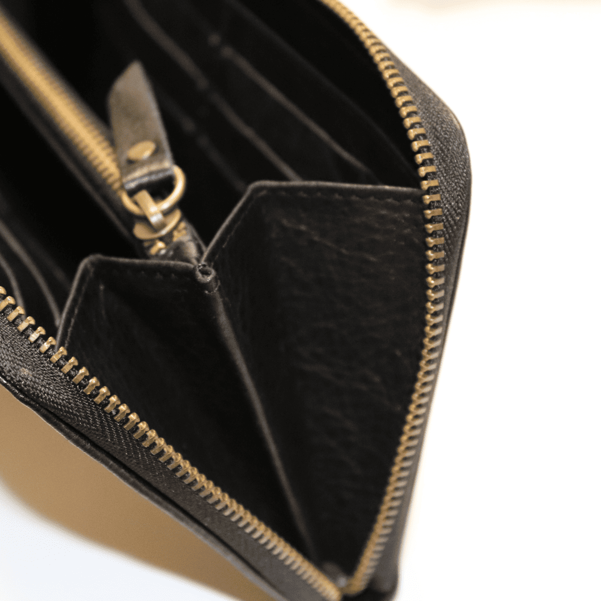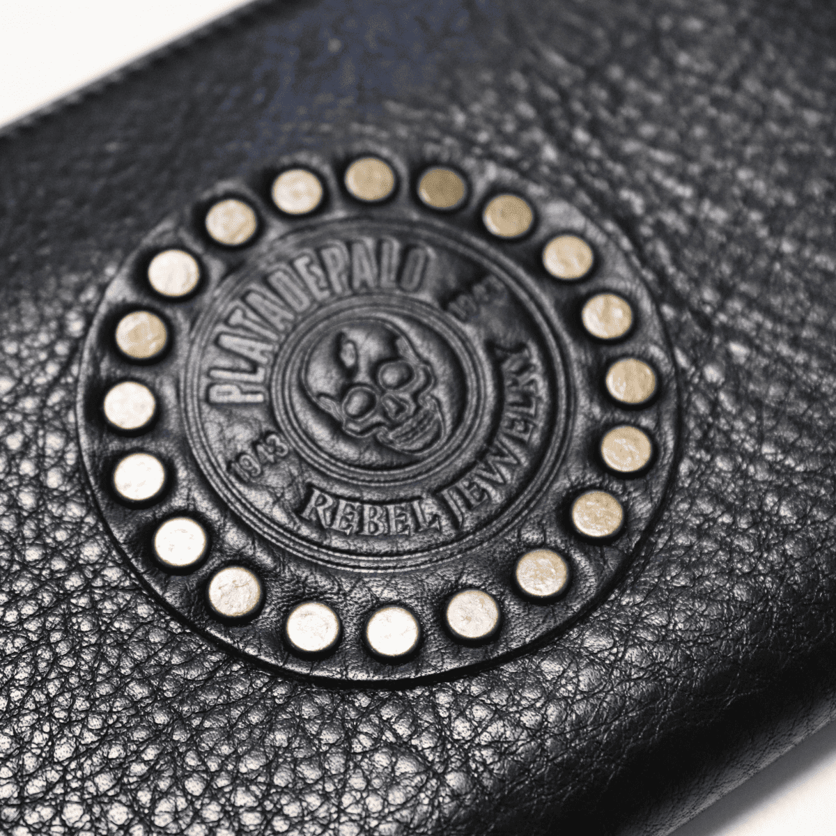 Mehrzweck-Geldbörse mit Reißverschluss aus schwarzem Leder, Maße 20 x 10 x 1,5 cm. Außen mit dem PLATADEPALO-Siegel gekennzeichnet.