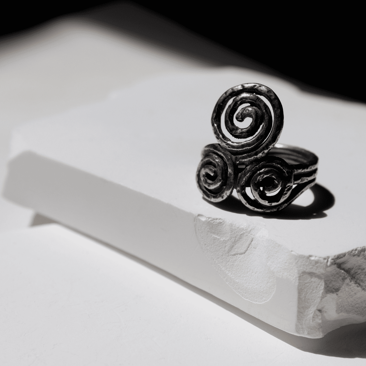 Kuraiho Damenring aus 925er Silber mit einem Design aus drei ineinander verschlungenen Spiralen.