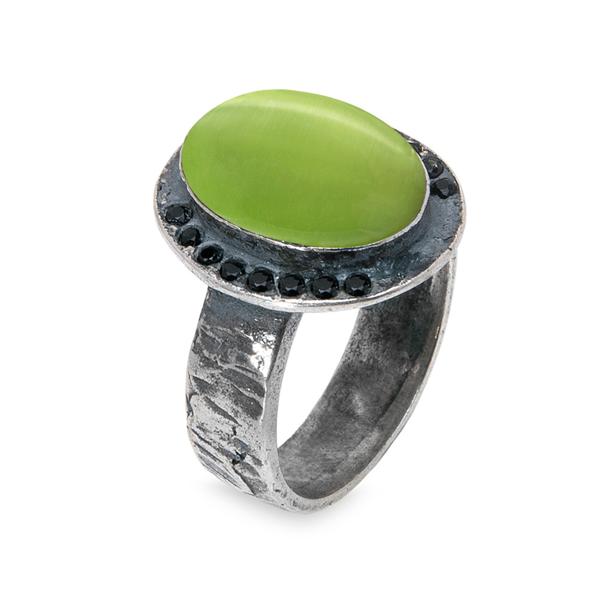 Sei Damenring aus 925er Silber mit einem zentralen grünen Stein, umgeben von weißen Zirkonen.