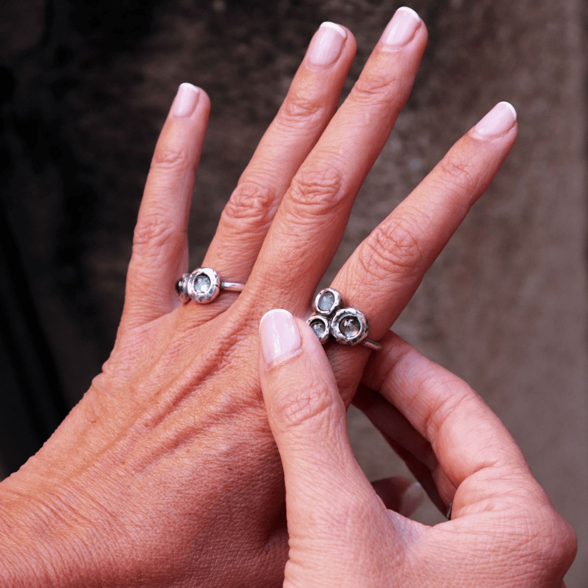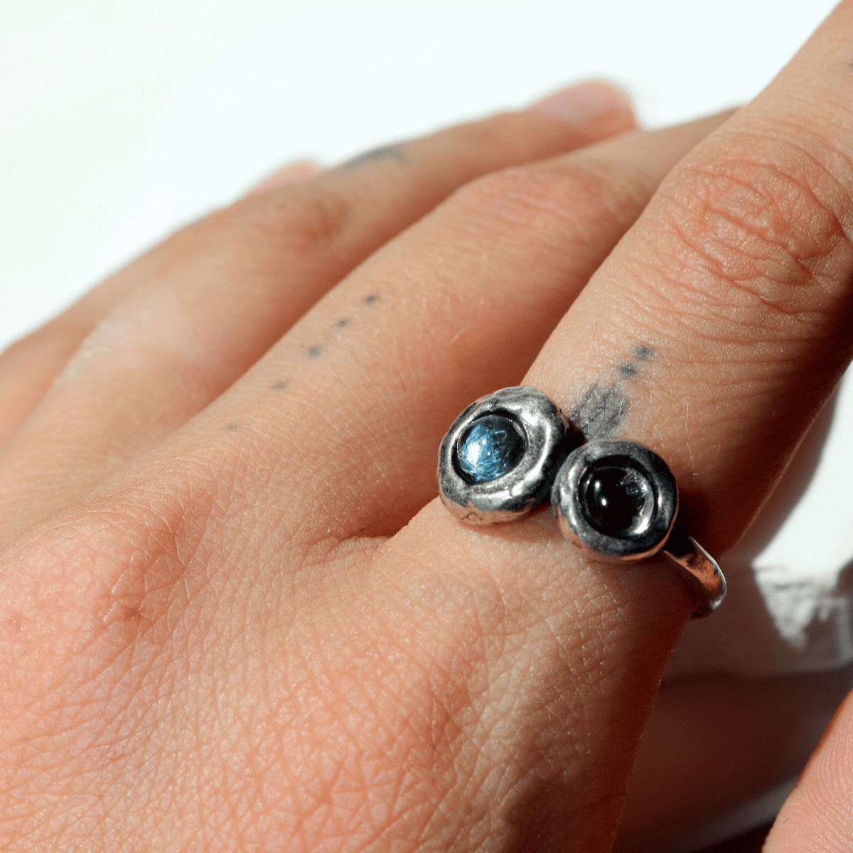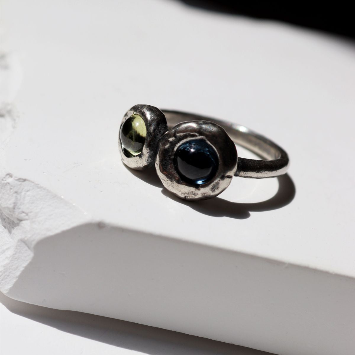 Shinkai Damenring aus 925er Silber mit zwei 5 mm großen runden Aquamarin- und Olivin-Edelsteinen in zarten Blautönen.