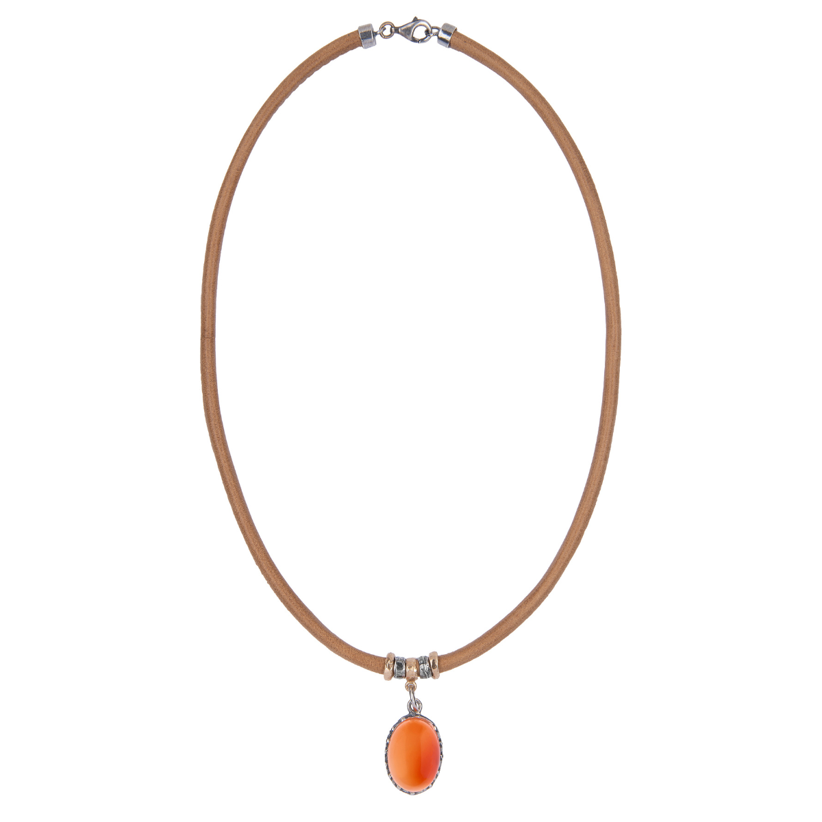 Damenhalskette Rin aus Kamelleder mit einem Anhänger aus Halbedelsteinen aus Karneol, Abstandshaltern aus 925er Silber und Bronze und einem Verschluss aus 925er Silber.