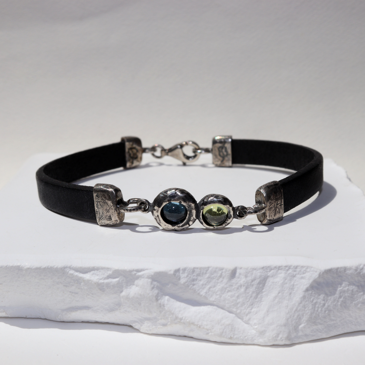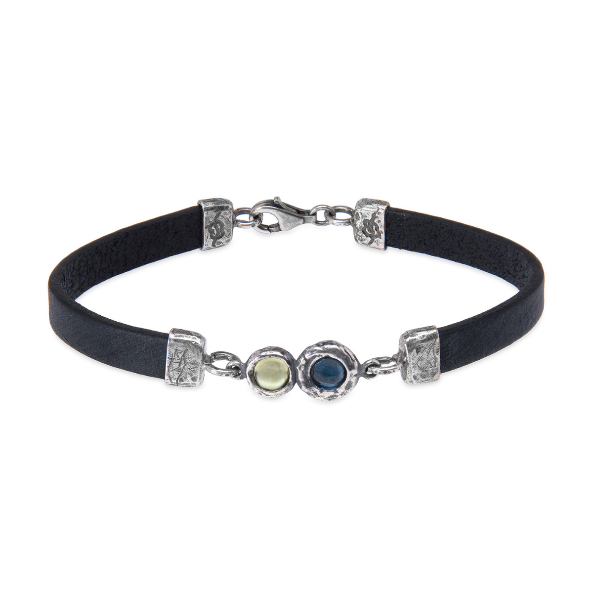 Shinkai-Lederarmband für Damen mit einem Mittelstück aus 925er Silber mit zwei 5 mm großen runden Aquamarin- und Olivin-Edelsteinen in zarten Blautönen.