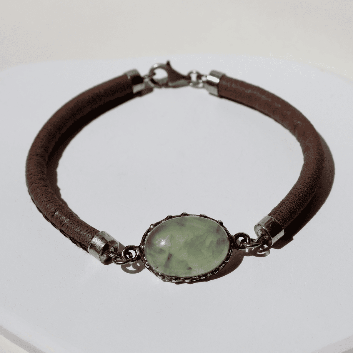 Mu Damen-Nerzlederarmband mit einem grünen ovalen Prehnit-Stein, Abstandshaltern und Verschluss aus 925er Silber.