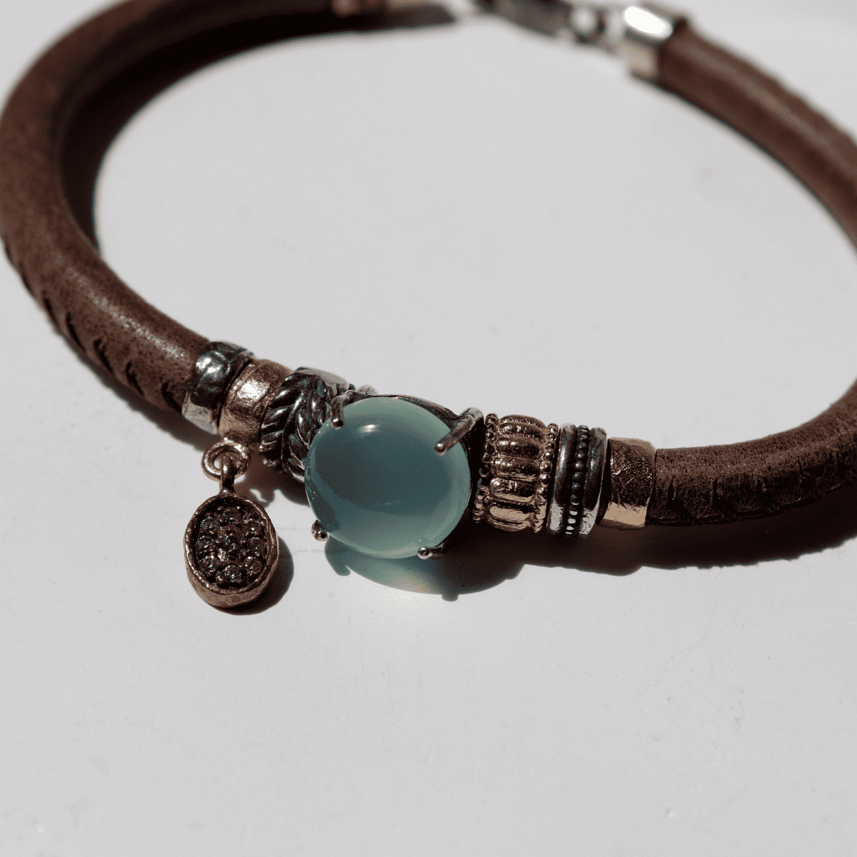 Tsuki-Armband aus Nerzleder für Damen mit einem blauen kaledonischen Grünstein, begleitet von einem Anhänger aus Bronze mit Zirkonen und Abstandshaltern aus Bronze und 925er Silber.