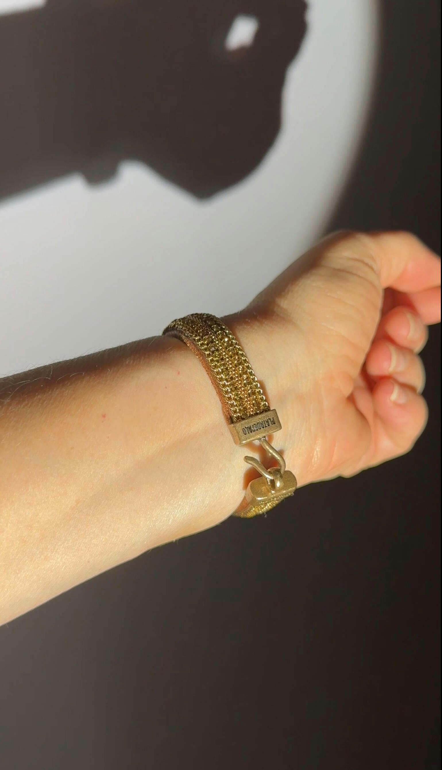 Das Jasira-Armband ist die perfekte Balance zwischen Stil und Raffinesse. Dieses aus 1 cm dickem, flachem Leder gefertigte Stück zeichnet sich durch seinen eleganten Goldbesatz und Glitzer aus, der ihm eine warme und natürliche Note verleiht.