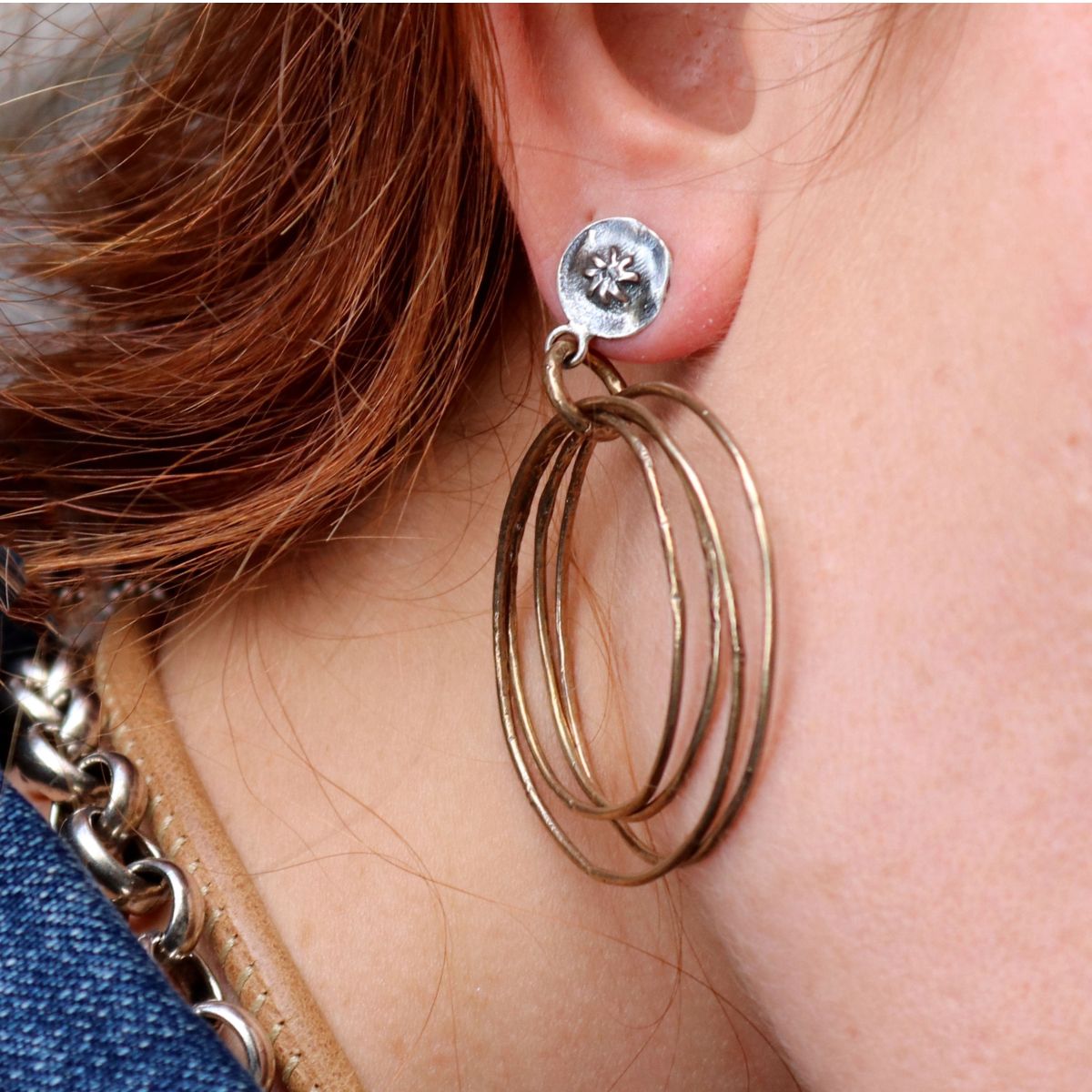 PLATADEPALO Creolen aus Bronze und 925er Silber. Durchmesser 4 cm und Länge 5,5 cm. Entworfen und handgefertigt von PLATADEPALO in Spanien.