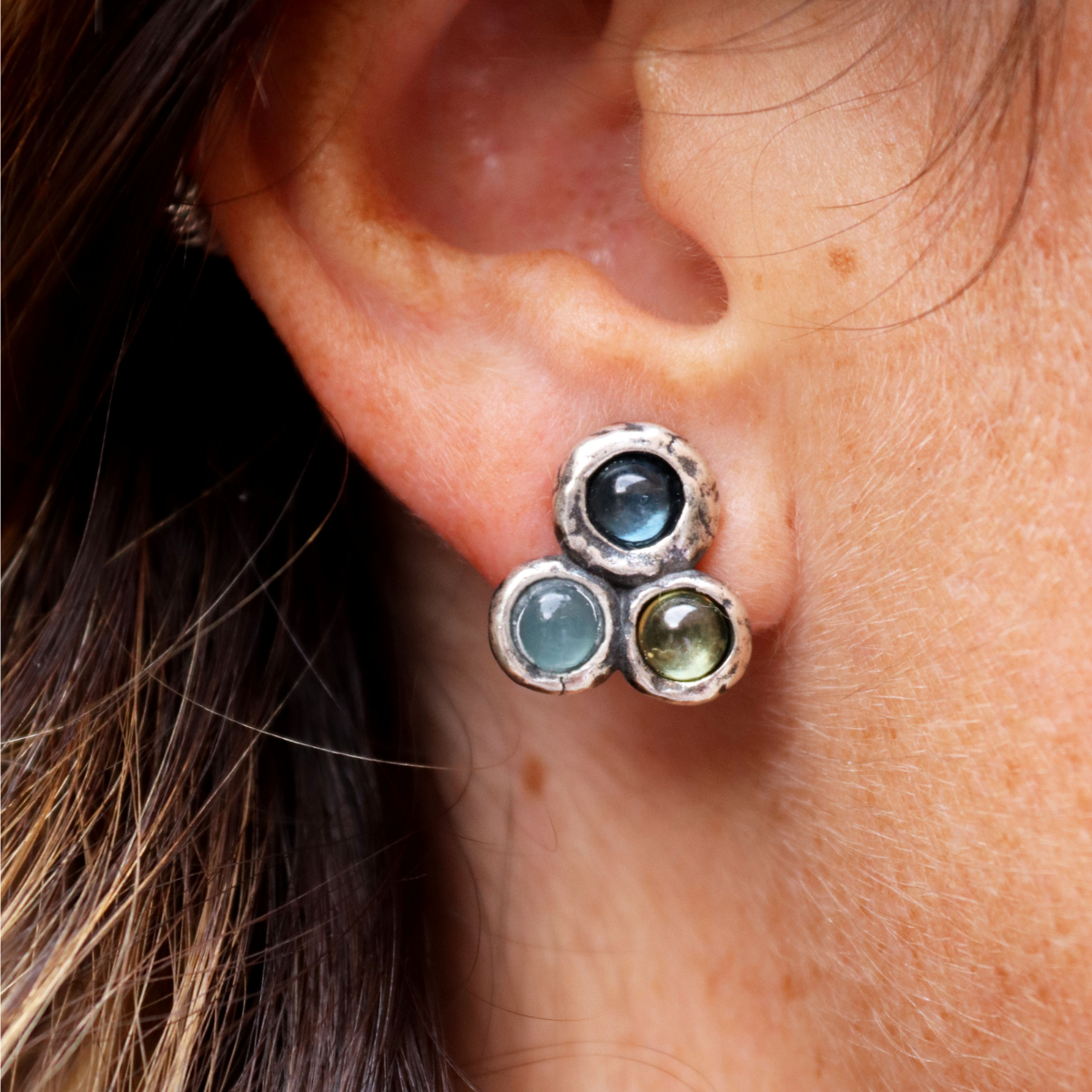 Kaiko Damenohrringe aus 925er Silber mit drei 5 mm großen runden Edelsteinen aus Aquamarin, Grün und Olivin in eleganten Blautönen.