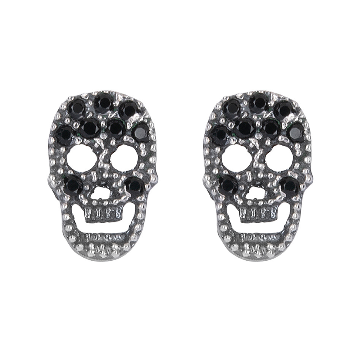 Unisex-Ohrringe „Seikatsu“ im Totenkopf-Design aus 925er Silber mit kleinen schwarzen Zirkonen.