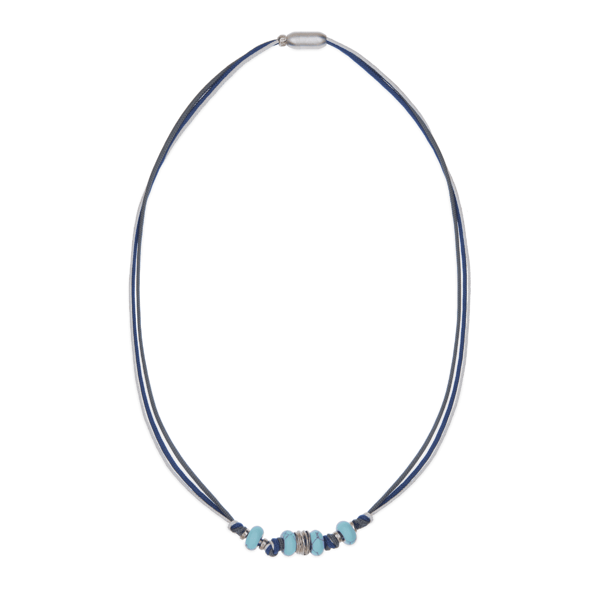 Diese einzigartige Halskette ist mit einer einzigartigen Bronzekugel verziert, die einen warmen und organischen Blickfang bildet. Ergänzend zum Design, vier lebendige Harze Eingestreutes Türkis und vier zusätzliche Abstandshalter aus Bronze erzeugen ein visuelles Spiel aus Texturen und Farbtönen, das an die Schönheit kristallklaren Wassers und der Erde erinnert.