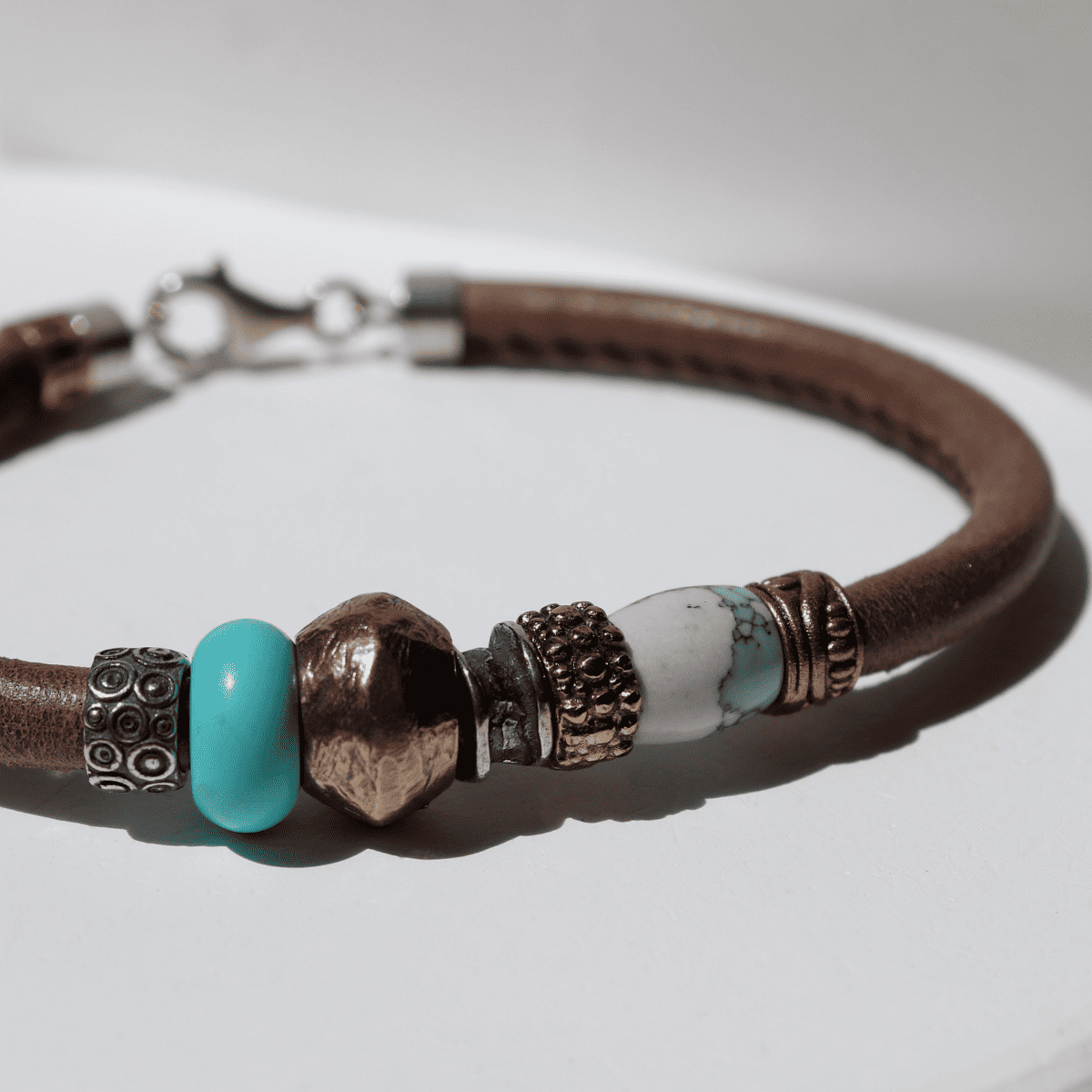 Shin-Damenarmband aus Nerzleder mit bronzenem Mittelstück, türkisfarbenem und cremefarbenem Harz sowie Abstandshaltern aus 925er Silber und Bronze. Silberverschluss und Bronzestück mit Platadepalo-Abzeichen.