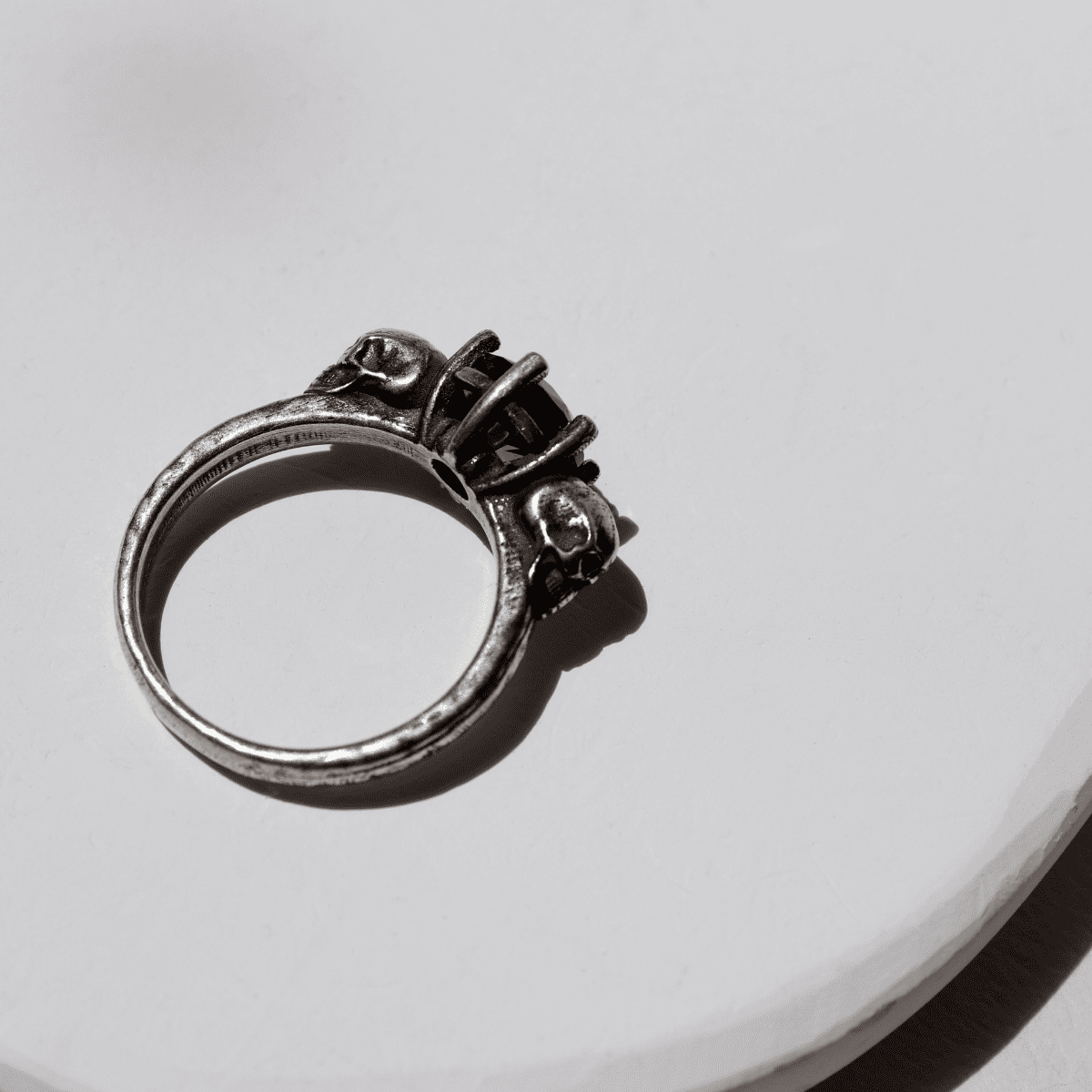 Izanami-Ring mit zwei Totenköpfen aus 925er Silber und Granatstein