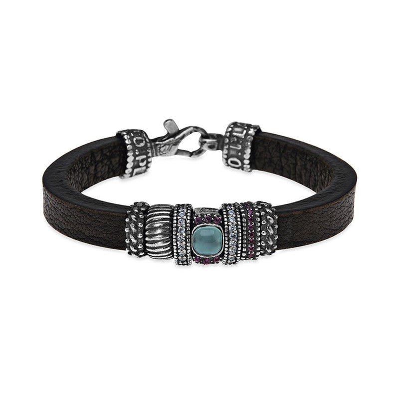 PLATADEPALO-Armband aus 925er Silber, Leder, Bronze und Zirkonen. Entworfen und handgefertigt von PLATADEPALO in Spanien. Dieses Stück wird für jeden Kunden von Hand gefertigt.