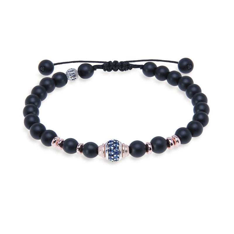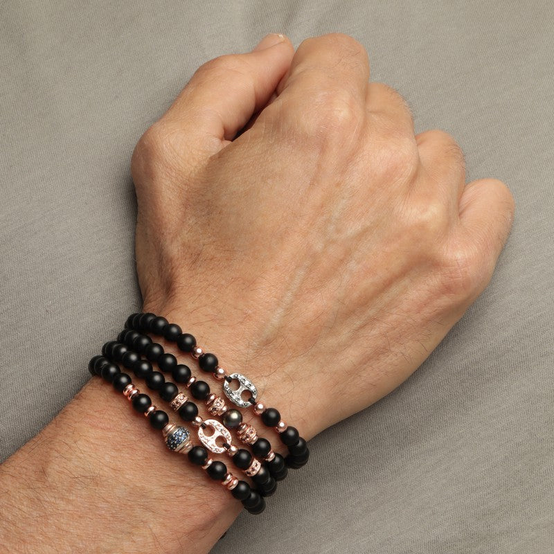 Ein neues Armband, perfekt für den Alltag. Dank der Vielseitigkeit der schwarzen Farbe der matten Onyxkugeln lässt es sich mit allem kombinieren. Kombiniert mit rosa Hämatit, einer silbernen Kugel mit blauen Zirkonen und rosévergoldeten Teilen für zusätzliche Eleganz. Entworfen und handgefertigt von PLATADEPALO in Spanien.