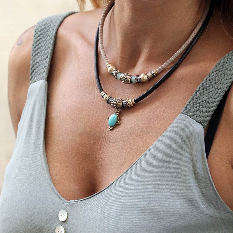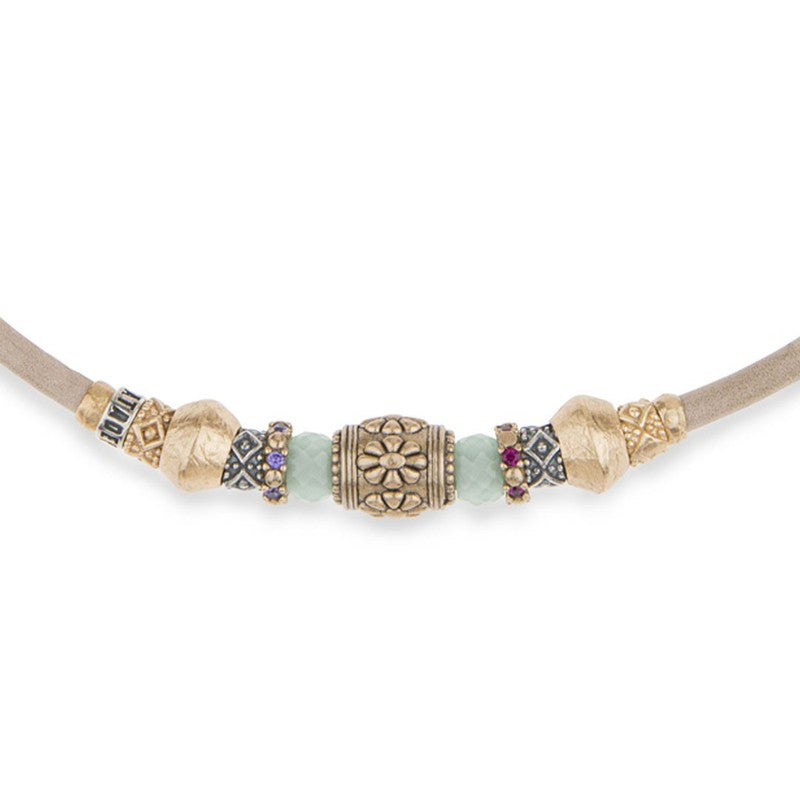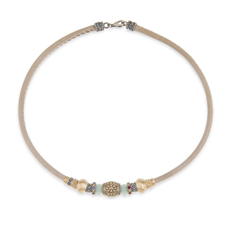 Länge 45 cm. 5 mm große steinfarbene Lederhalskette mit Abstandshaltern aus Bronze und antikem 925er Silber, facettierten Chalcedon-Donuts, Rubin- und Amethyst-Zirkonen.