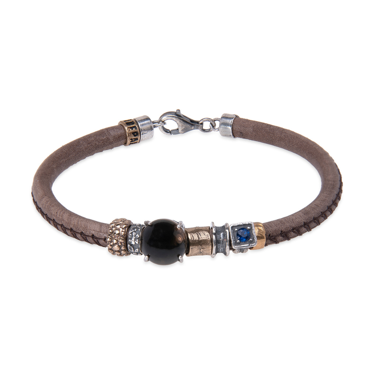 Tenshi Damenarmband aus dunkelbraunem Leder mit einem 925er Silber-Abstandshalter, der einen schwarzen Rauchquarzstein mit bronzenen und silbernen Abstandshaltern einfasst.