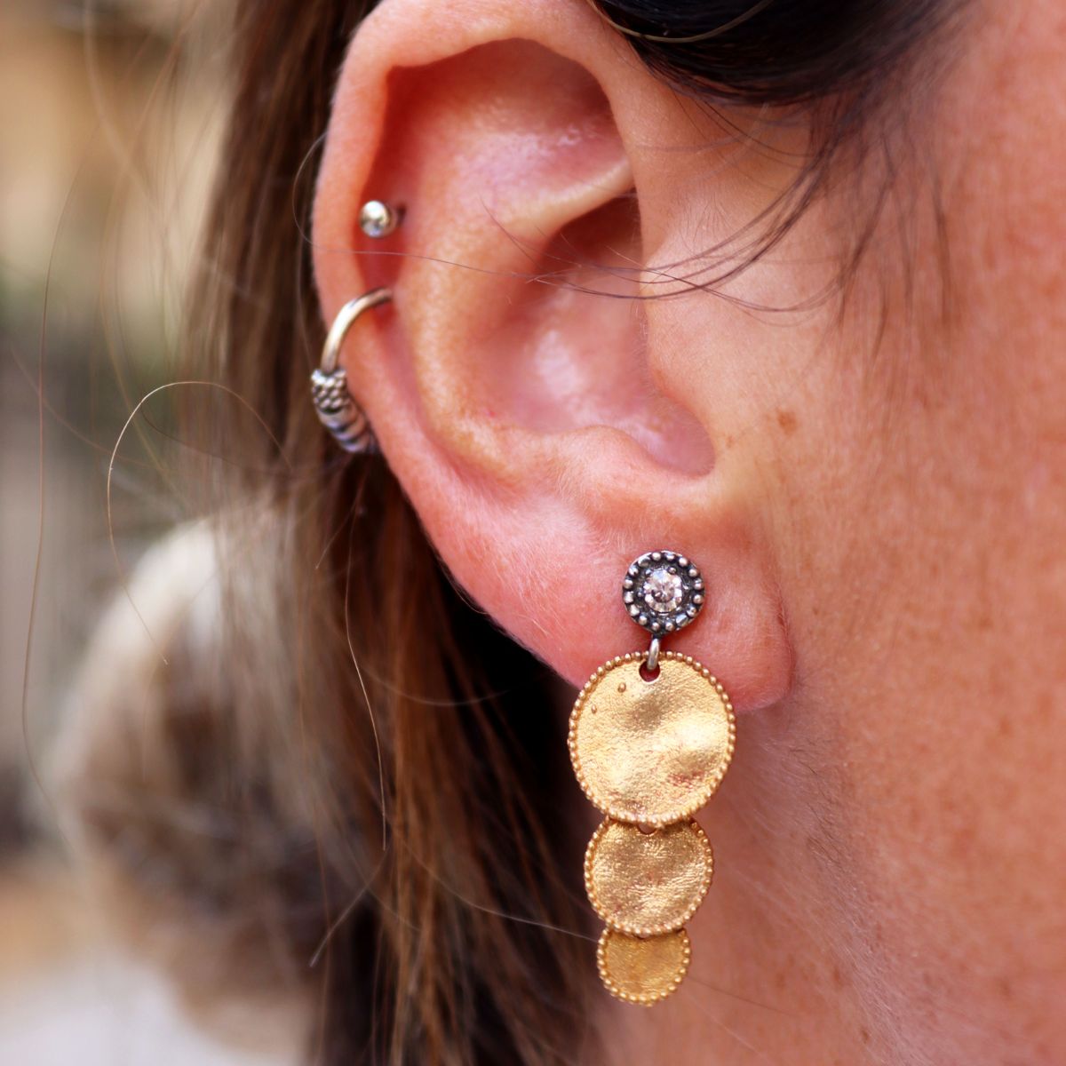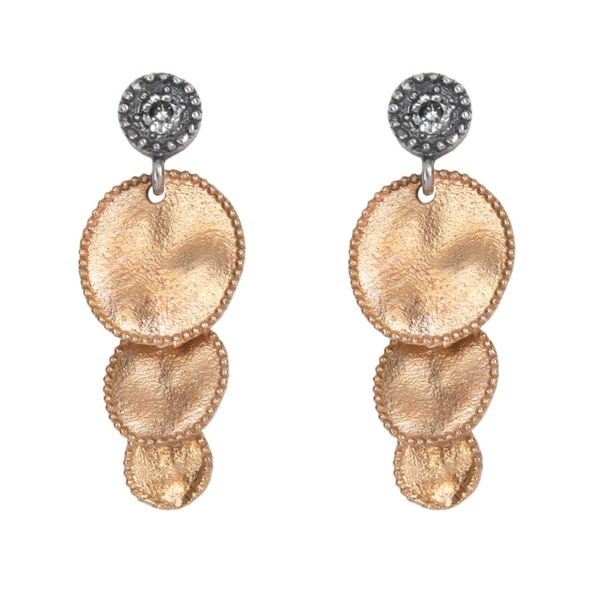 Hoshikuzu women's earrings with circular bronze medallions in a descending cascade format, and hypoallergenic 925 sterling silver pin and clasp.