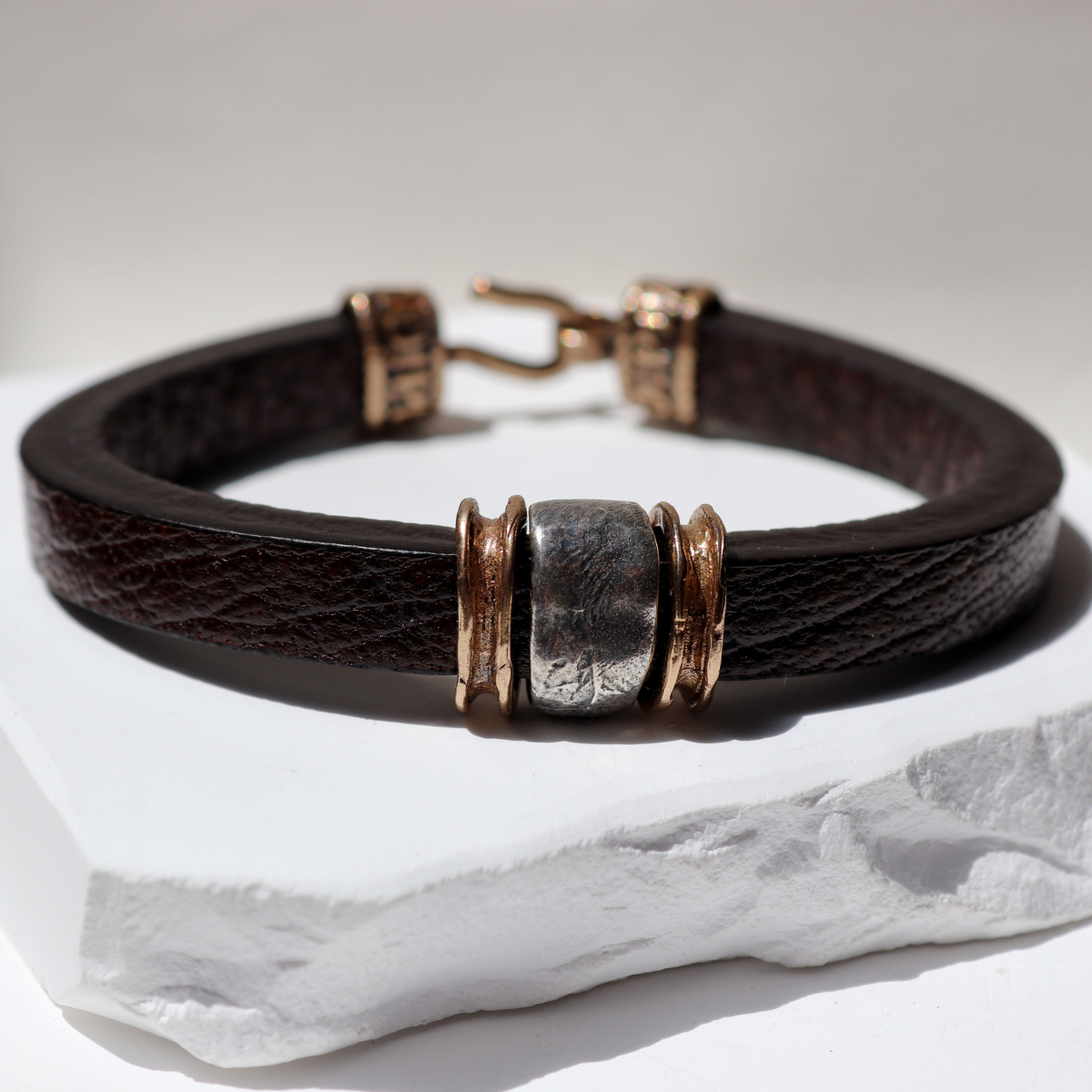 Kokyu Men's Leather Bracelet with 925 Silver and Bronze Pieces