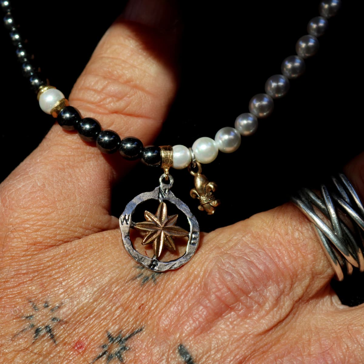 El Collar Hombre Mazar es una pieza artesanal hecha a mano en España por PLATADEPALO, que une Plata 925, perlas de agua dulce, hematites y bronce para un diseño moderno, elegante y masculino. El colgante en forma de brújula aporta un toque simbólico, evocando aventura, exploración y libertad.