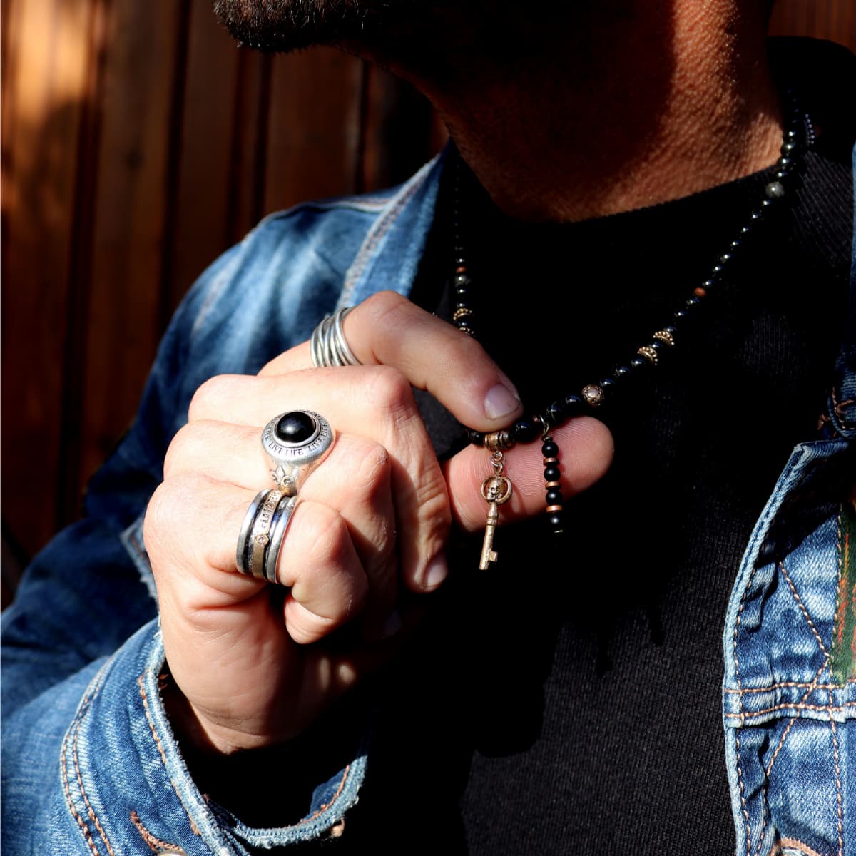 Este collar masculino de 50 cm combina piedras de ónix negro en acabado brillo. El diseño destaca por su colgante central en forma de llave de bronce, acompañado de piezas de bronce envejecido y un cierre de mosquetón de Plata 925 de alta seguridad. El nombre de la pieza rinde homenaje a Tánger, la mítica ciudad del norte de Marruecos, evocando su carácter cosmopolita, fuerte y lleno de historia.