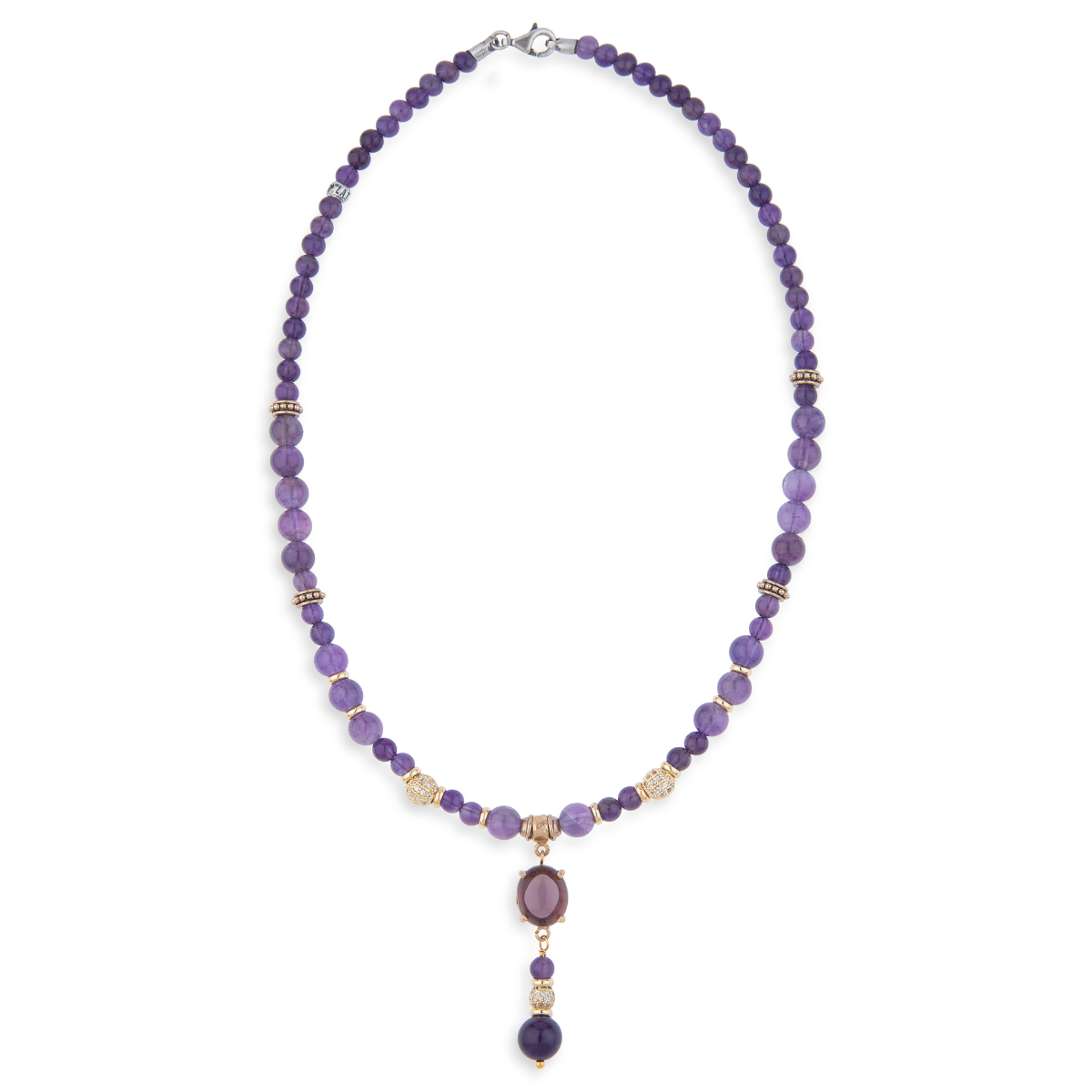 A bead necklace made of bronze and amethyst. It includes bronze pieces with zircons and an amethyst centerpiece.