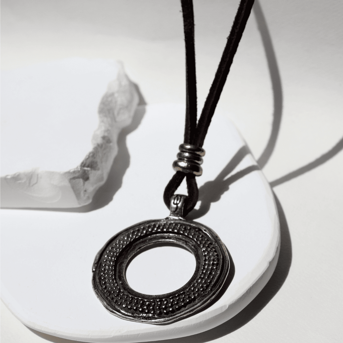 The Tetsu necklace is an expression of quiet strength and authenticity. Its name, of Japanese origin, means "iron ," evoking resilience, grit, and determination. The thick leather symbolizes the steadfastness of someone who remains true to themselves, while the solid silver pendant represents clarity and inner courage. The steel clasp adds a functional touch without sacrificing aesthetics, reinforcing the idea that beauty can also be indestructible. Tetsu is not just a necklace: it's a statement of character, designed for women who move forward with a firm step and a determined gaze.