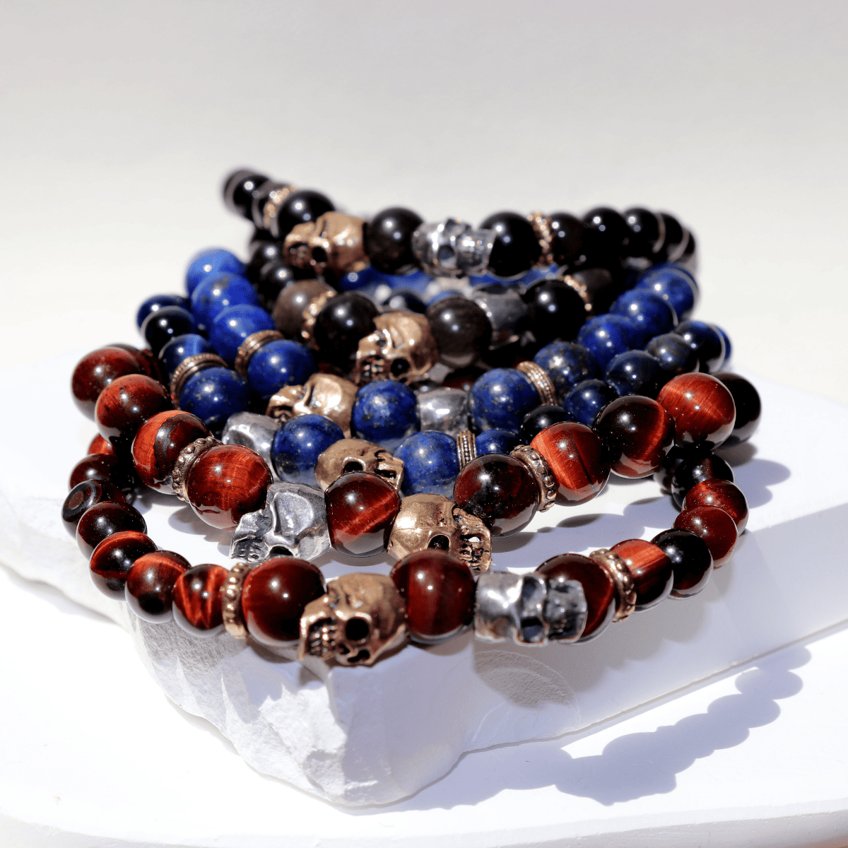 Kaizen unisex elastic thick bead bracelet with 8 mm brown oxeye stones, a 925 silver skull, a bronze skull, and 925 silver knot covers.