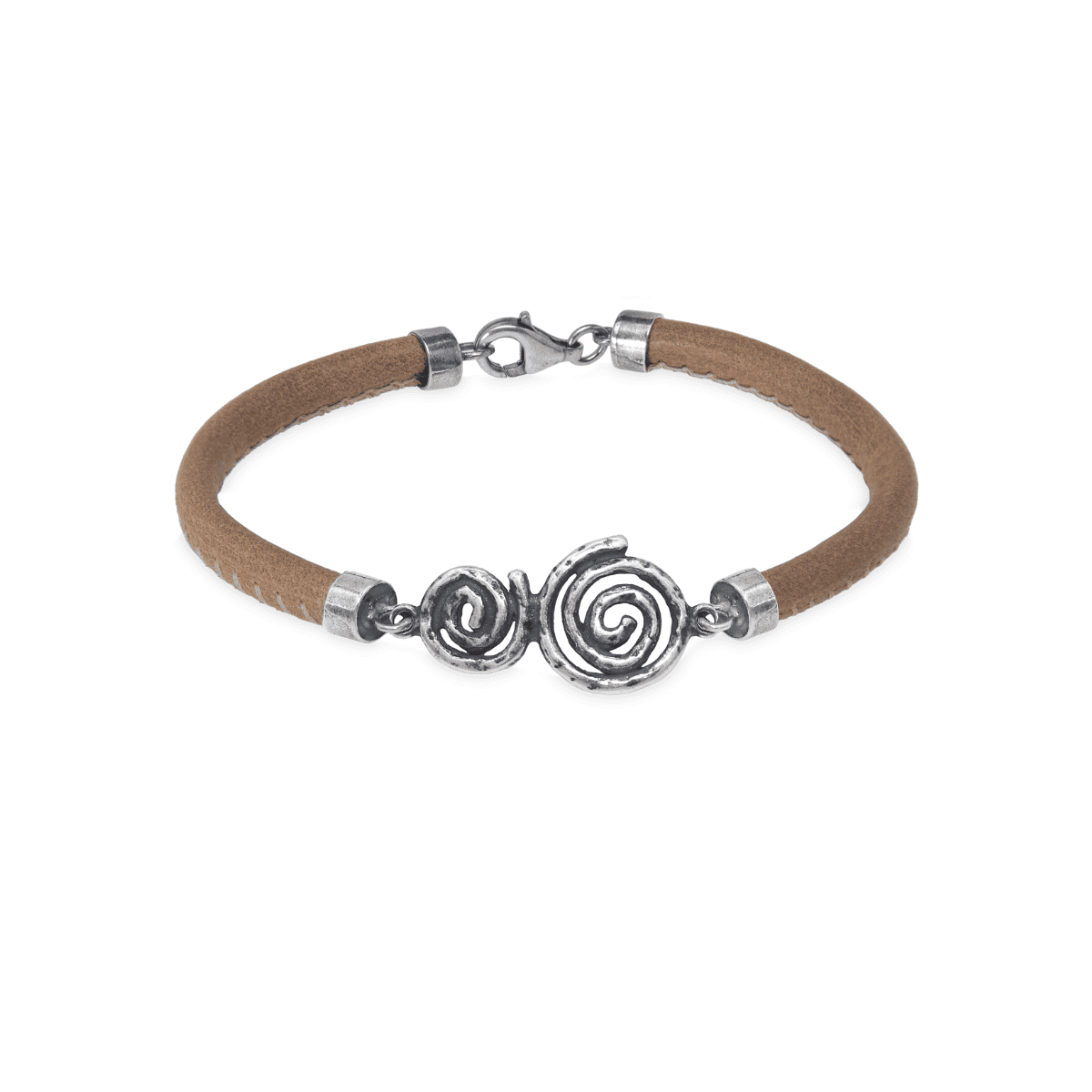 Yugen women's leather bracelet with a centerpiece featuring two intertwined 925 silver spirals. Includes a 925 silver clasp for durability.