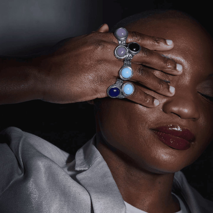 This 925 silver ring is a unique piece of jewelry that combines the freshness of green chalcedony with the depth of sapphire. The two carefully selected circular stones add a touch of color and sophistication to any look.