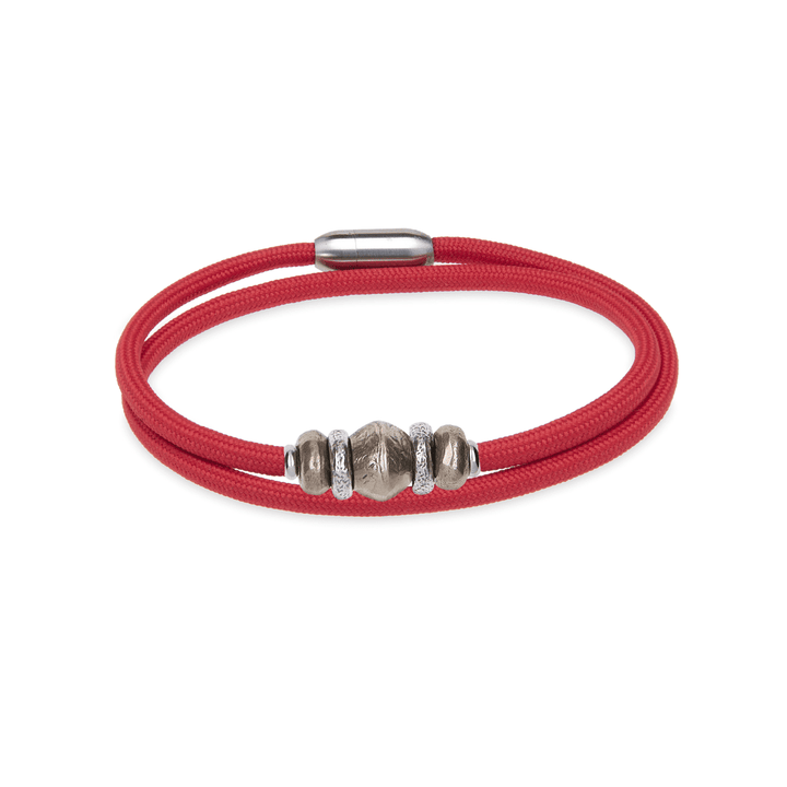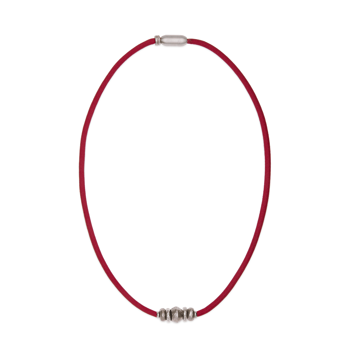 Awaken your boldest spirit with this essential piece from PLATADEPALO, designed to be worn as either a necklace or a bracelet. The deep red nylon evokes the power of fire and the depth of emotions. At its center, an imposing bronze interlocking piece forged with our signature artistry is complemented by the elegance of two fine 925 silver pieces and two more bronze pieces. The combination of metals and this vibrant hue creates a jewel with an unmistakable soul, perfect for those who dare to stand out and embrace the essence of authenticity.