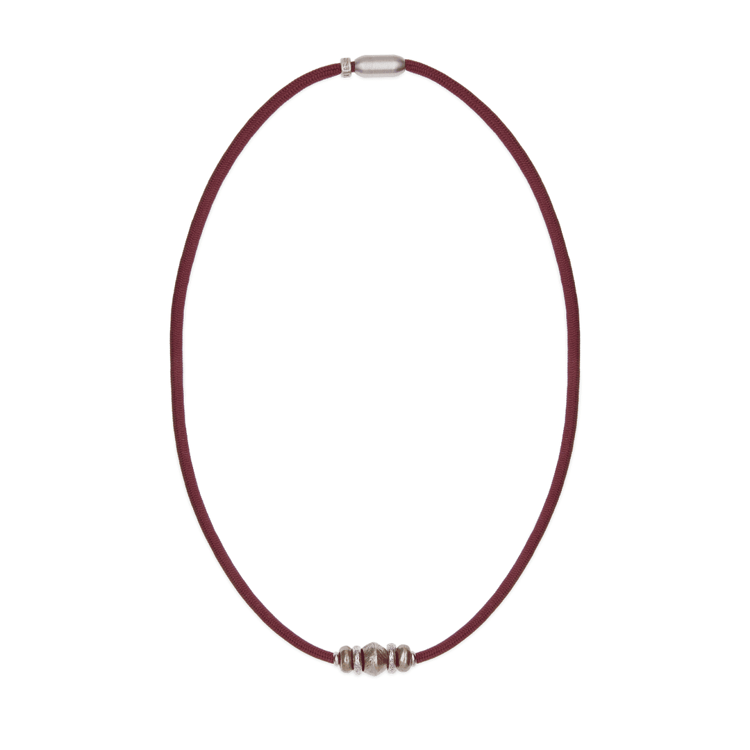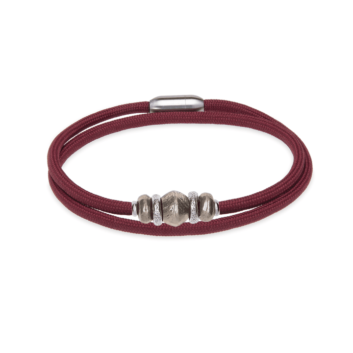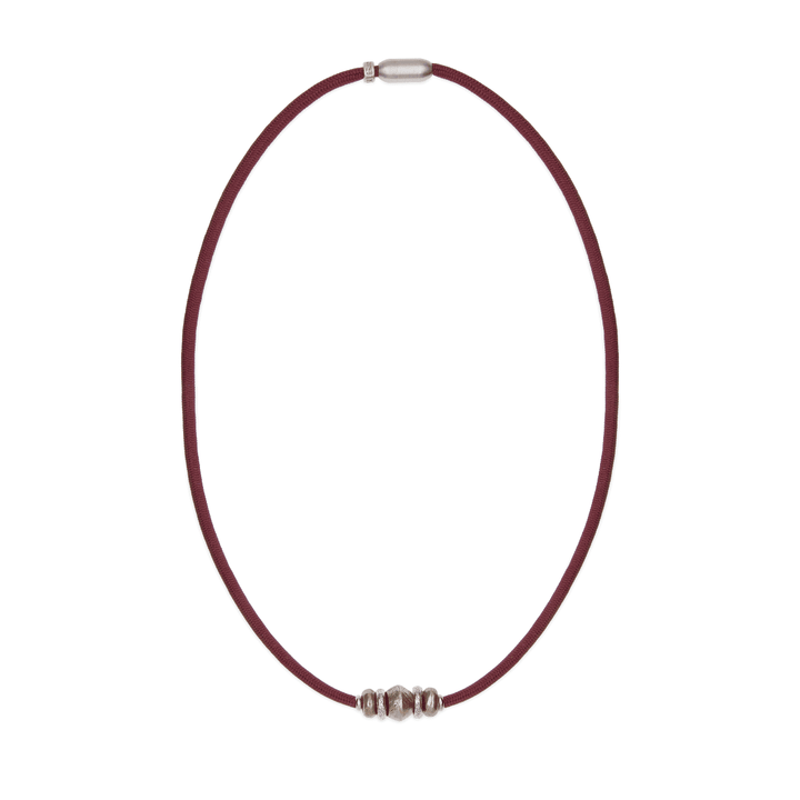 Immerse yourself in timeless elegance with our versatile piece, which adapts to your neck or wrist. Garnet nylon, a color that evokes the richness of vineyards and the depth of history, serves as the perfect backdrop. At its heart, a robust bronze centerpiece radiates forged character. Flanked by two fine pieces of 925 silver that add a glimmer of light, and two more in bronze, this jewel makes a subtle yet striking statement of style. Ideal for those seeking an authentic piece with a touch of sophistication and the unmistakable essence of PLATADEPALO.