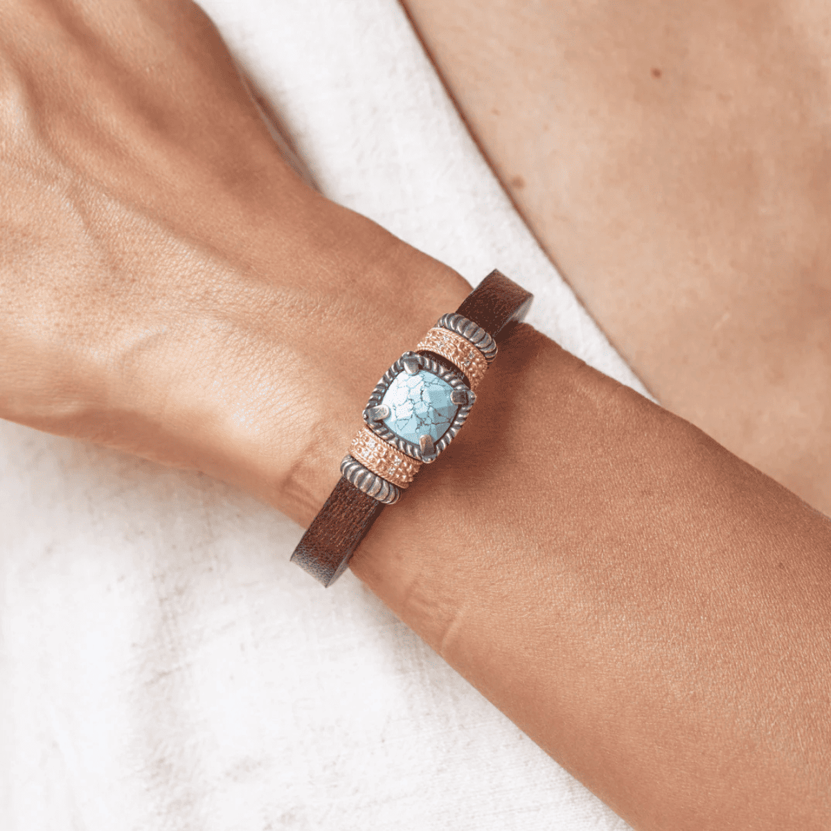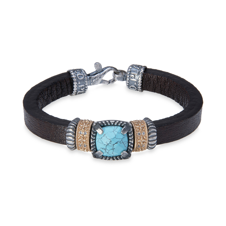 Caelum women's bracelet in high-end leather, featuring a square turquoise chalcedony center bead. 925 sterling silver and bronze spacers set with white cubic zirconia. Silver lobster clasp.
