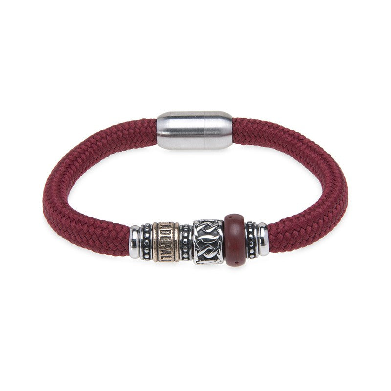 Papagaran garnet nylon bracelet with stainless steel pieces, garnet resin, and a bronze piece with the brand logo. Magnetic clasp. Designed and handcrafted by PLATADEPALO in Spain.
