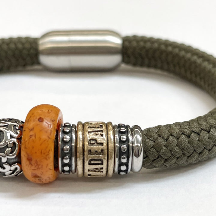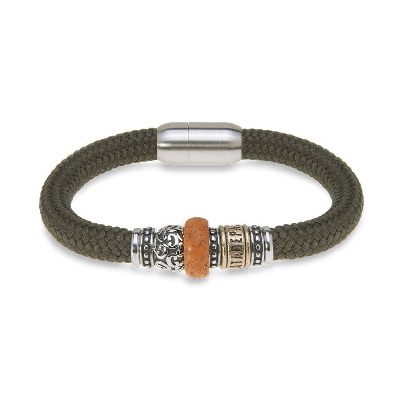 Immerse yourself in the wonders of marine life with this bracelet from our nautical capsule. Made in a green tone and decorated with steel, bronze with the brand logo and resin spacers. Designed and handcrafted by PLATADEPALO in Spain.
