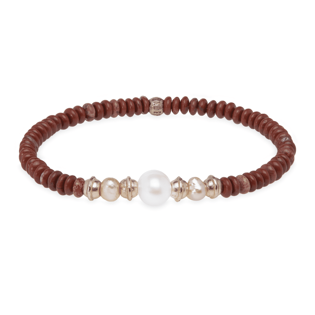 Wrap your wrist in the vibrant warmth of carnelian, a stone that radiates energy and strength. This unique bracelet is embellished with the purity of a white pearl and two delicate pink pearls, creating a harmonious contrast. The unique bronze UFOs add a touch of mystery and originality, making this piece a balanced and characterful piece.